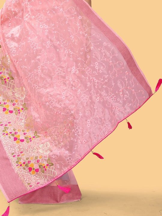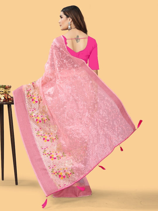 Sangria Pink & White Floral Embroidered Zari Organza Bagh Sarees
