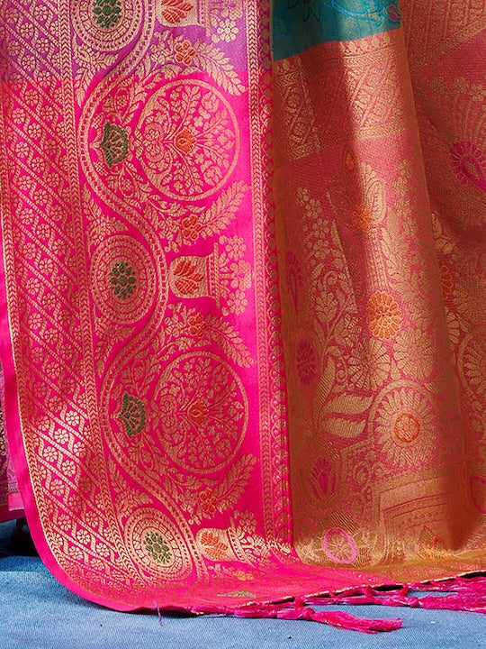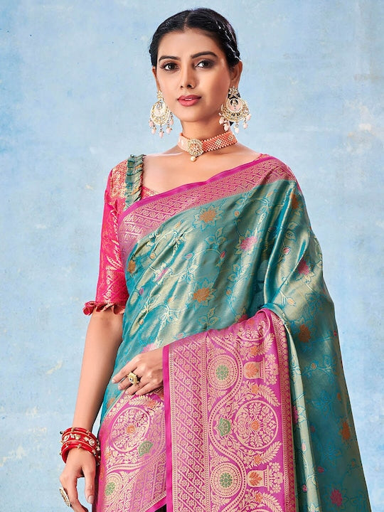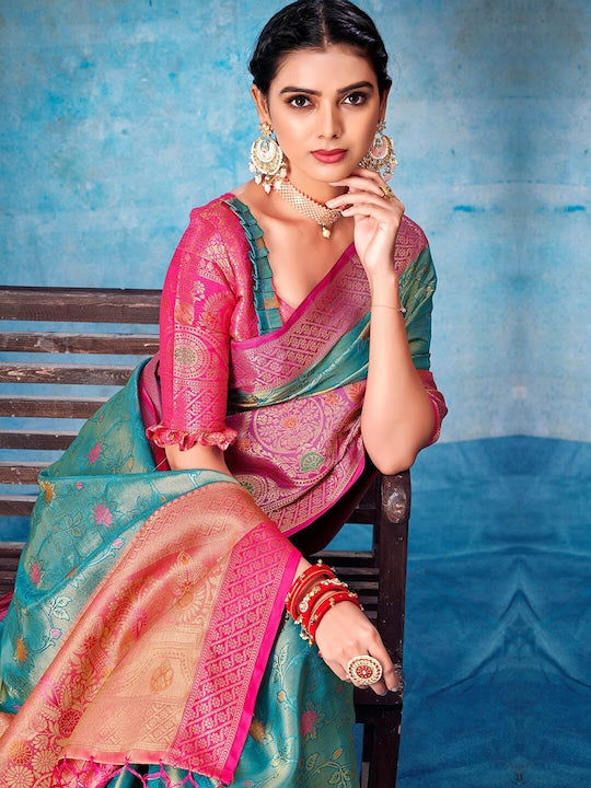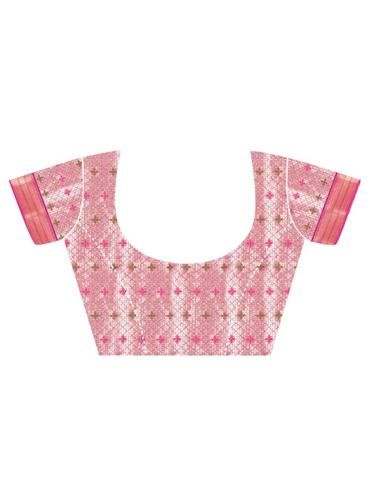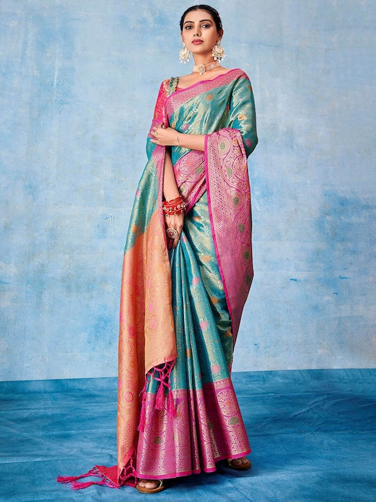 • Disclaimer: The saree comes with an unstitched blouse piece; the blouse worn by the model could be for modeling purposes only. Please refer to the image of the actual blouse piece for accuracy.