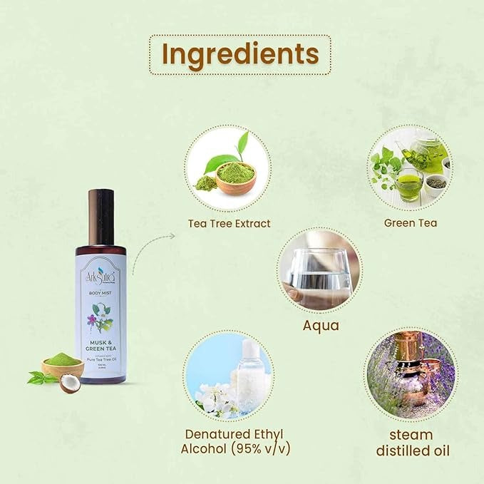• Ingredients: Our Musk & Green Tea Body Mist is made using pure Tea Tree Extract and organic almond & coconut oil. We do not use any chemical or synthetic ingredients for fragrance.