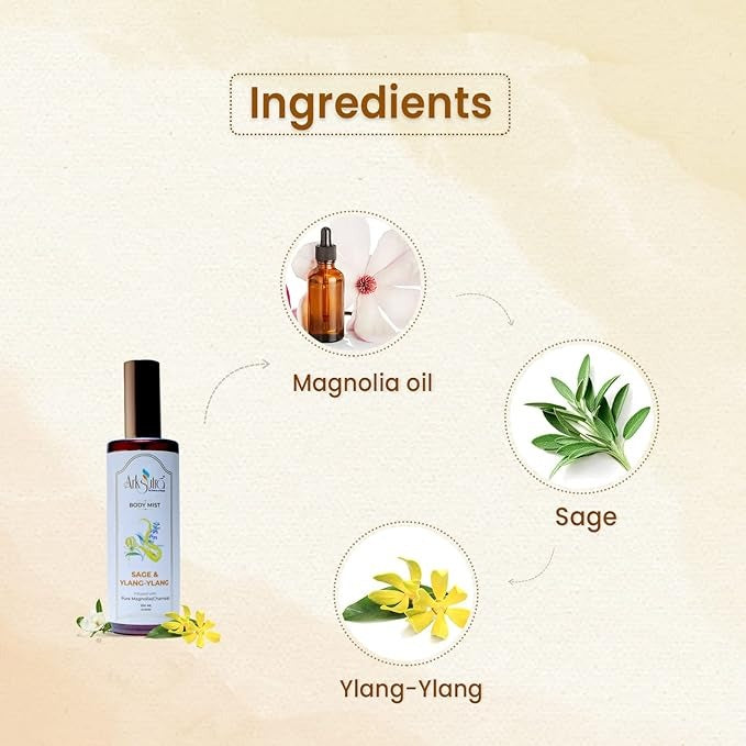 • Ingredients- Our Sage & Ylang-Ylang Body Mist is made using pure Magnolia (Champa), Sage & Ylang-Ylang. We do not use any chemical or synthetic ingredients for fragrance.