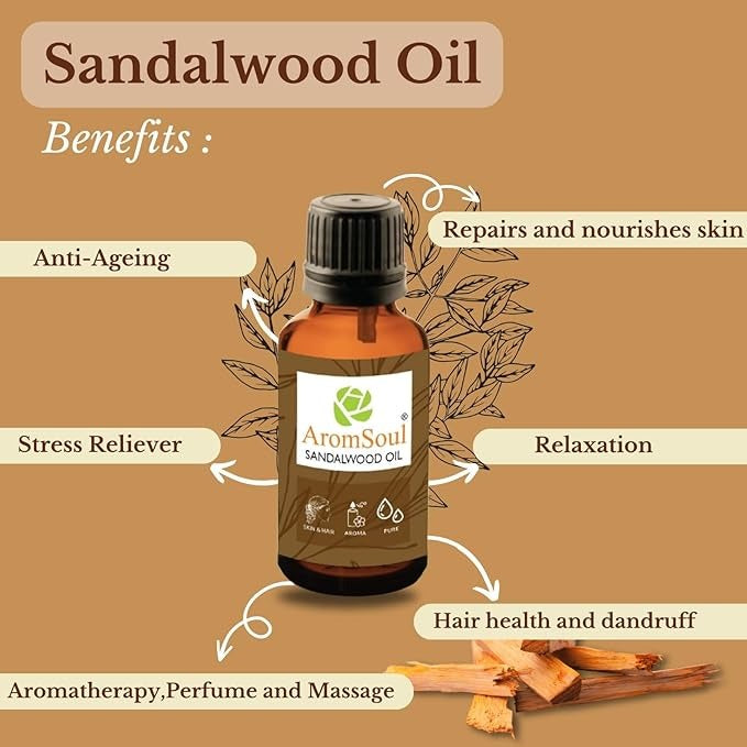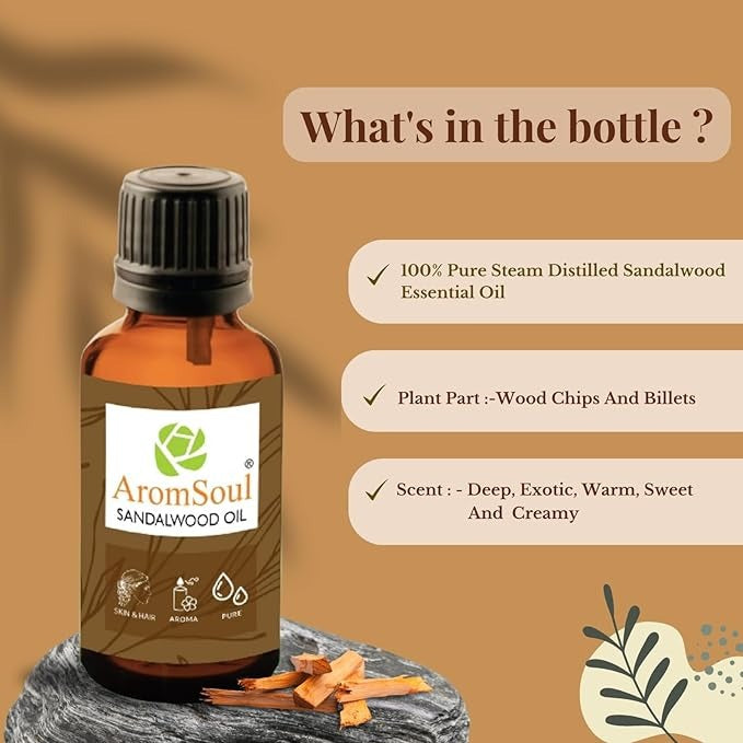 • Experience the pure essence of Sandalwood with our Aromsoul Sandalwood Essential Oil.