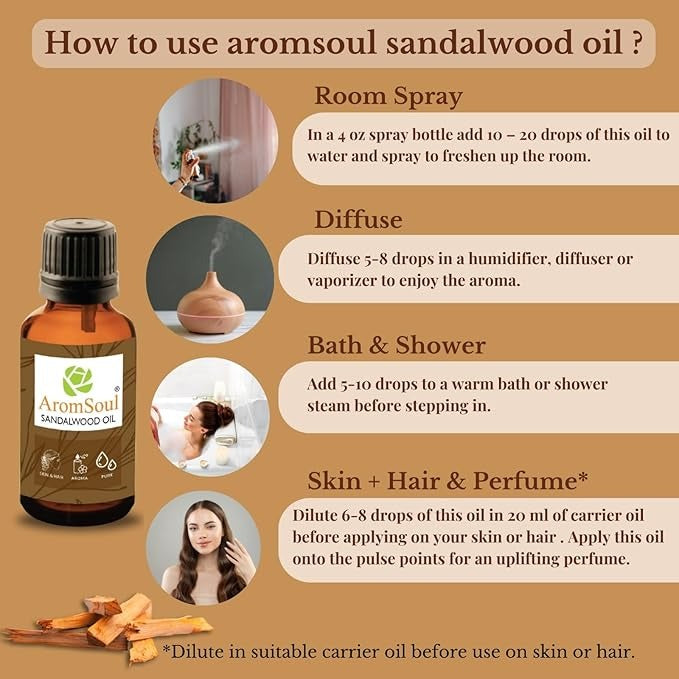 • Transform your bath into a spa retreat with our Aromsoul Sandalwood ( Chandan ) oil :-Just a few drops in your bathwater fills the air with the calming scent of Sandalwood, bringing relaxation and renewal. Sandalwood oil also soothes the skin, leaving it soft and refreshed after your bath.