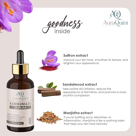 - Infused with the goodness of Kumkumadi oil, this serum combines traditional Ayurvedic ingredients known for their skin-brightening and anti-aging properties.