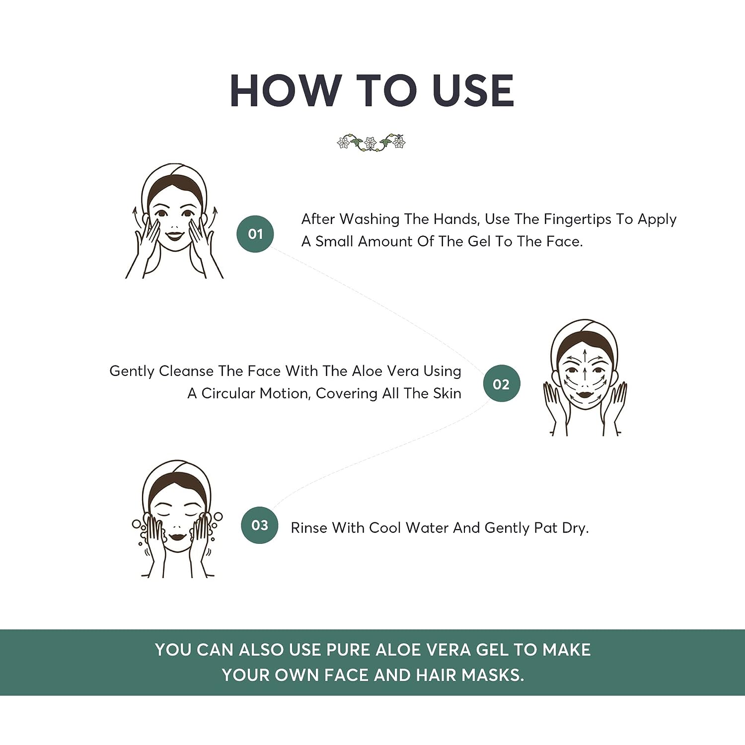 - Gently cleanse the face with aloe vera using a circular motion, covering all the skin.