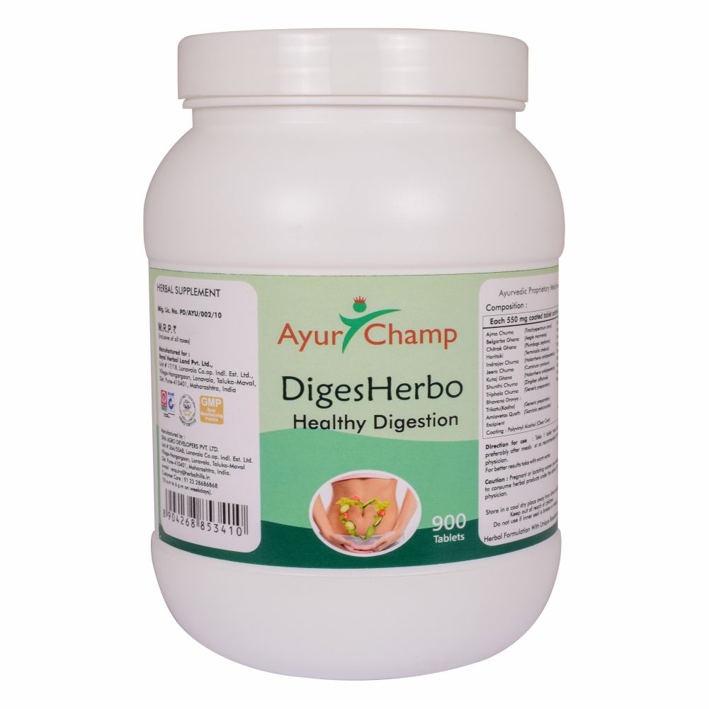 • DigesHerbo Tablet is a unique formulation enriched with powerful Ayurvedic ingredients like Triphala, Ajma, Jeera, Belgarbha. It gently cleanses & soothes intestinal walls ensuring regular bowel movement without any abdominal cramps and is also effective on associated problems like gas, acidity, & flatulence.