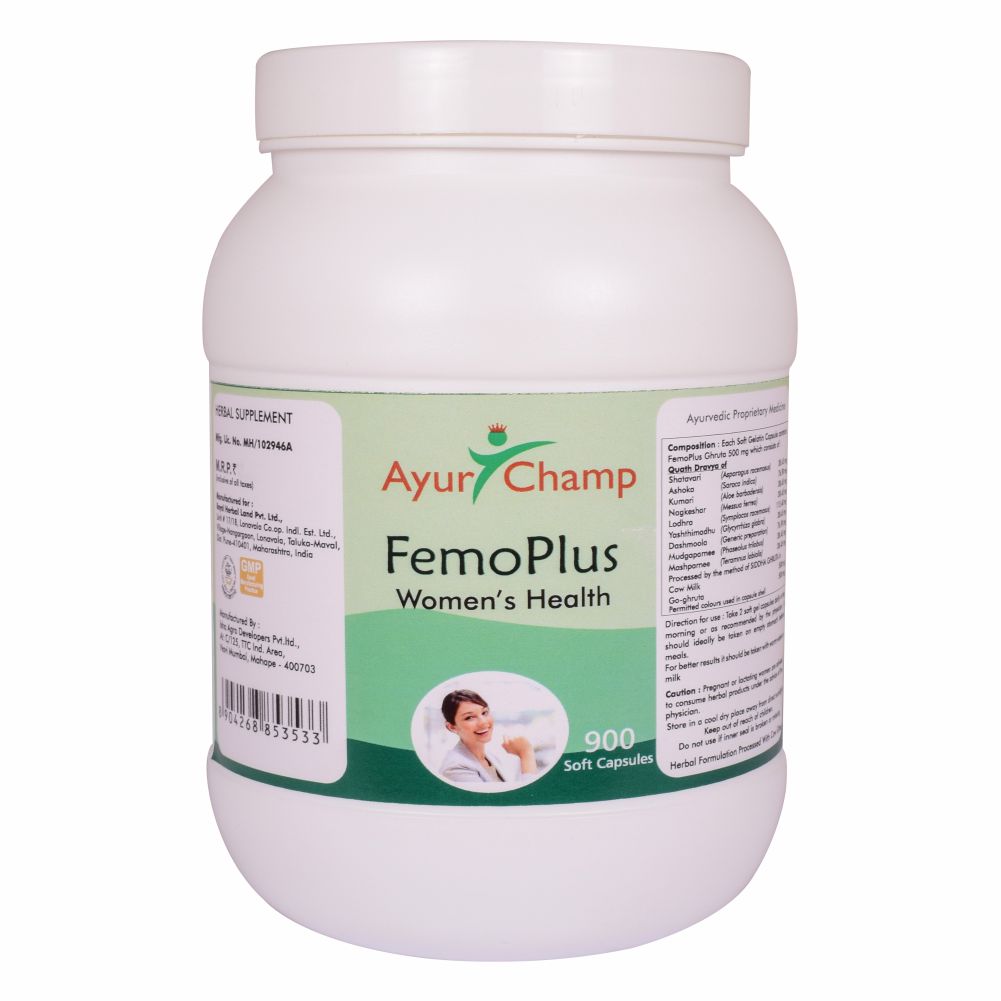 • AyurChamp FemoPlus is a complete benefitting system with natural herbs like Shatavari, Ashoka, Lodhra and Dashmoola.