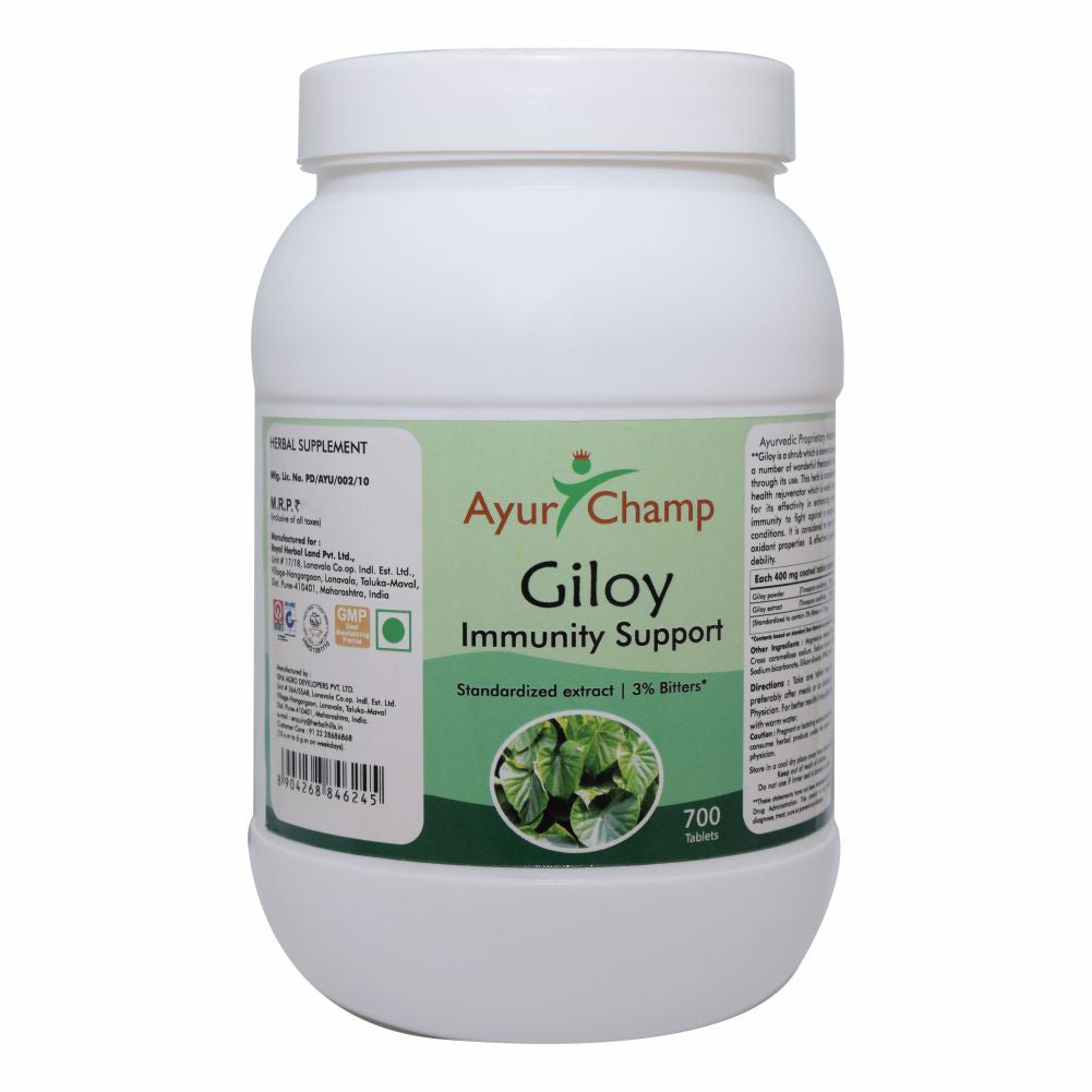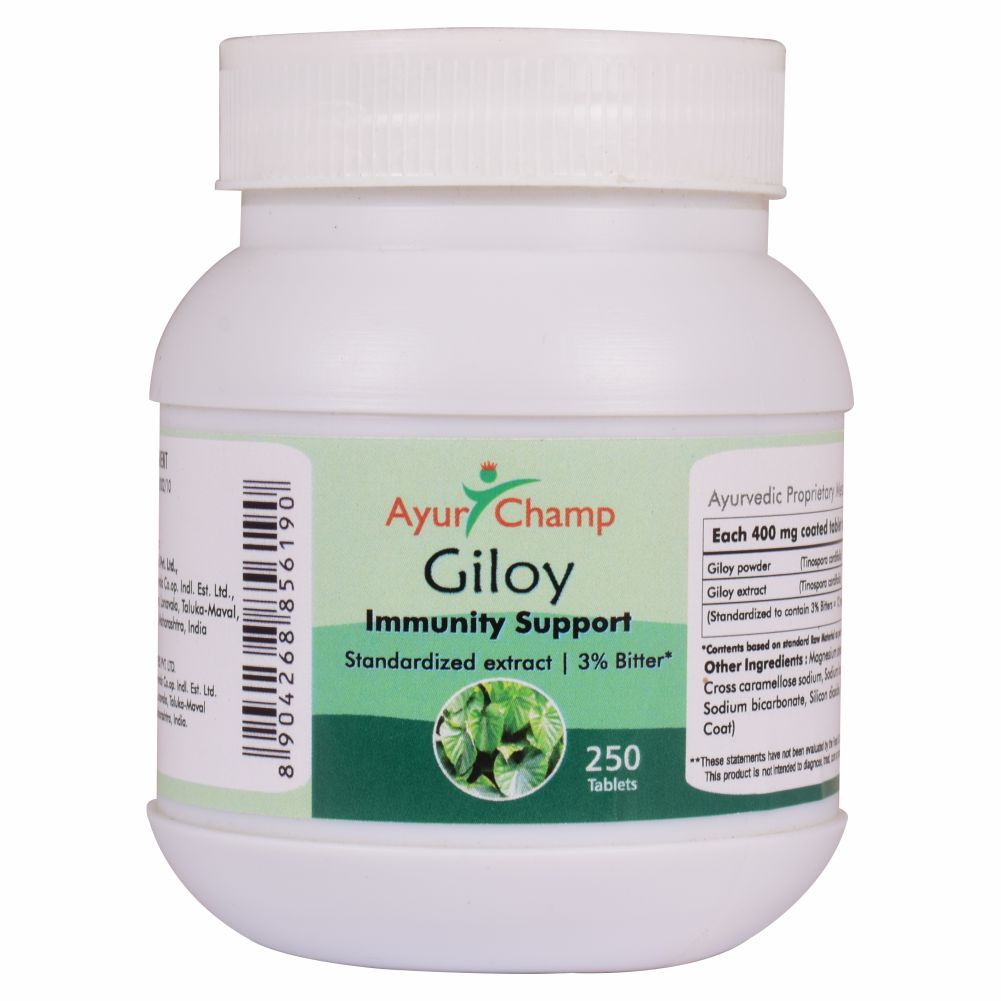 - Giloy or Guduchi is also known as Gulvel or Tinospora cordifollia. Guduchi is interdependently processed with the latest technologies at Ayur Champ to produce herbal Tablets called Giloy.