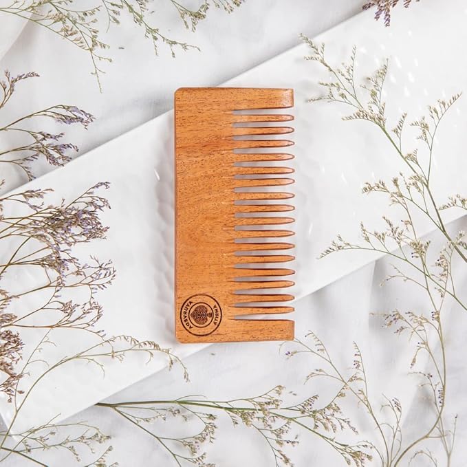 Ayurveda Amrita Organic Twin Tooth & Short Detangle Neem Wood Comb | Helps in Dandruff Removal