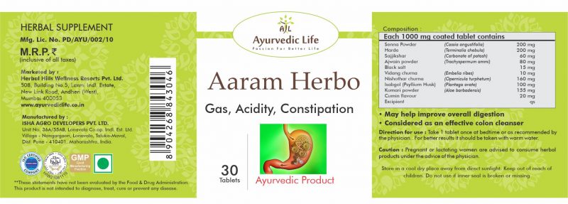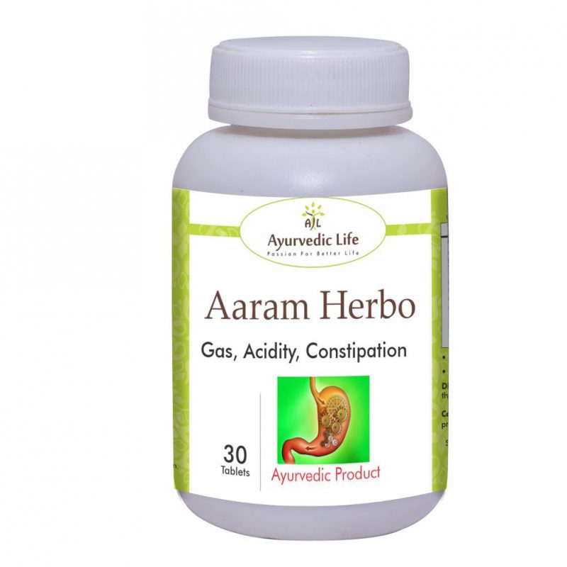 - Aaram Herbo tablet can be used for Ayurvedic purposes. Ayurvedic Life Aaram Herbo tablet helps to give relief from Constipation, Acidity & Gas.