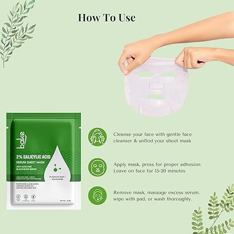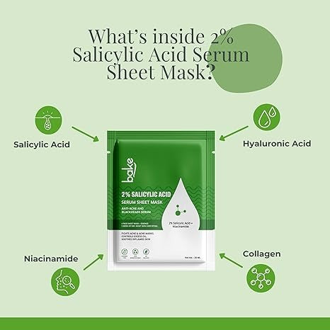 • BLACKHEADS REMOVAL: BAKE 2% Salicylic Acid Serum Sheet Mask helps in reducing blackheads by unclogging pores and controlling excess oil with salicylic acid and niacinamide