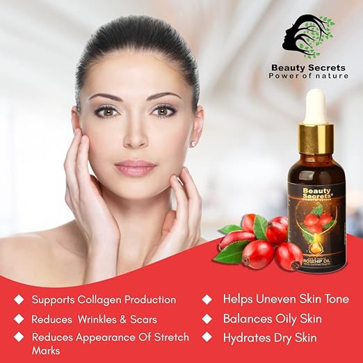 • GET THAT DEWY, SUN-KISSED GLOW YEAR ROUND. All your Skin needs is BEAUTY SECRETS ROSEHIP OIL as it is packed with the potent combination of natural nutrients which include Omega-3, Omega-6 and Omega-9 essential fatty acids, linoleic acid, Vitamin E. Lycopene and Beta carotene, a natural form of Vitamin A.