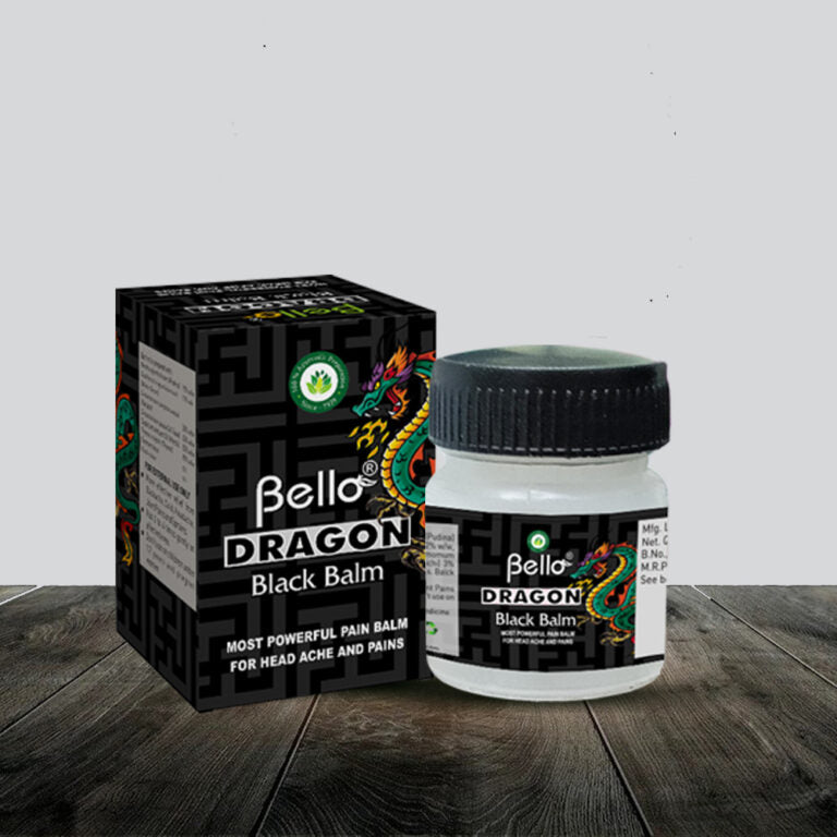 Bello Dragon Black Balm is a distinctive herbal balm, crafted with a blend of botanical ingredients traditionally appreciated for their aromatic qualities and refreshing sensation. This product features key ingredients such as mentha piperita (pudina), gaultheria fragrantissima (wintergreen), cinnamomum cassia, and thymus vulgaris (thymol), all combined in a smooth ointment base. Double powdered compared to standard balms for a distinctive texture