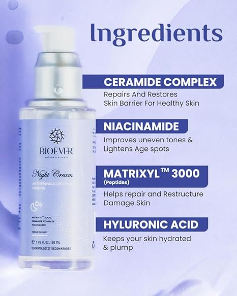 • Suitable for All Skin Types - Dermatologically tested, Bioever night Cream is gentle and effective for all skin types, including oily, dry, and combination skin, ensuring broad compatibility and enhanced skin health.