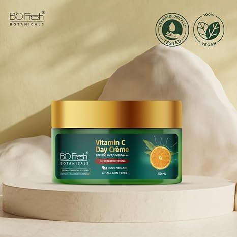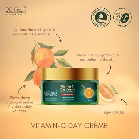 - Product Details: Contains 1 Pack of Vitamin-C Day Cream SPF-30 | Weight: 50ml | Form Type: Cream | Treats: Brightens Skin Tone & Dark Spots | Skin Type: Suitable for All Skin Types | Paraben Free | Reduce Dark Spots and Signs of Aging and brighten your skin with Biofresh Botanicals Vitamin-C Day Cream SPF 30.