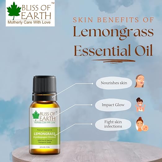 • Lemongrass oil is one of the most popular essential oils. It is known for its soothing and calming properties. Because of its impressive level of quality, bliss of earth Lemongrass oil lets you experience the full benefits of the fresh, lemony & earthy aroma. It is great for aromatherapy, massage and therapeutic usage including relief from excessive perspiration, muscle aches, stress & acts as insect repellent