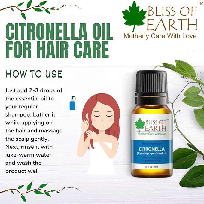 • PREMIUM QUALITY OIL: Bliss of earth citronella essential oil is extracted by steam distillation of citronella grass. We follow strict guidelines to protect the natural properties of the oil during extraction and packaging. Our oil is therapeutic grade for maximum potency. All Bliss of earth essential oils are packaged carefully to ensure best quality
