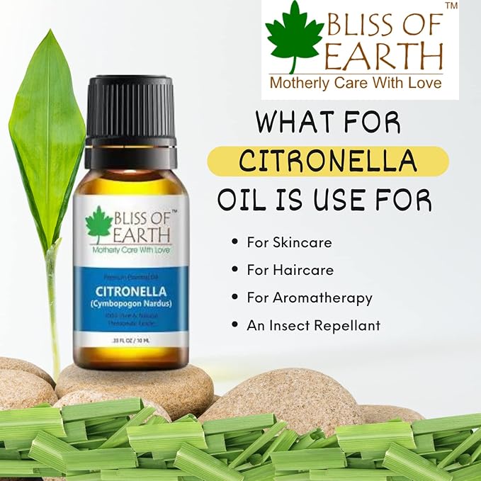 • ALL-NATURAL INSECT REPELLENT - No more insects, bugs & rodents after diffusing Bliss of earth citronella essential oil. It will make them all go away, naturally & peacefully. Apply Bliss of earth citronella essential oil mixed with any BLISS OF EARTH carrier oil directly to the body for more effective protection against bugs