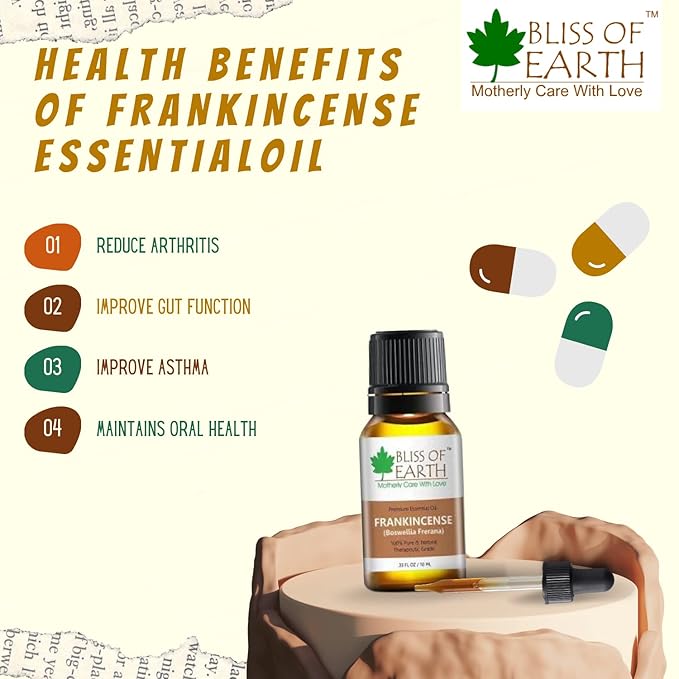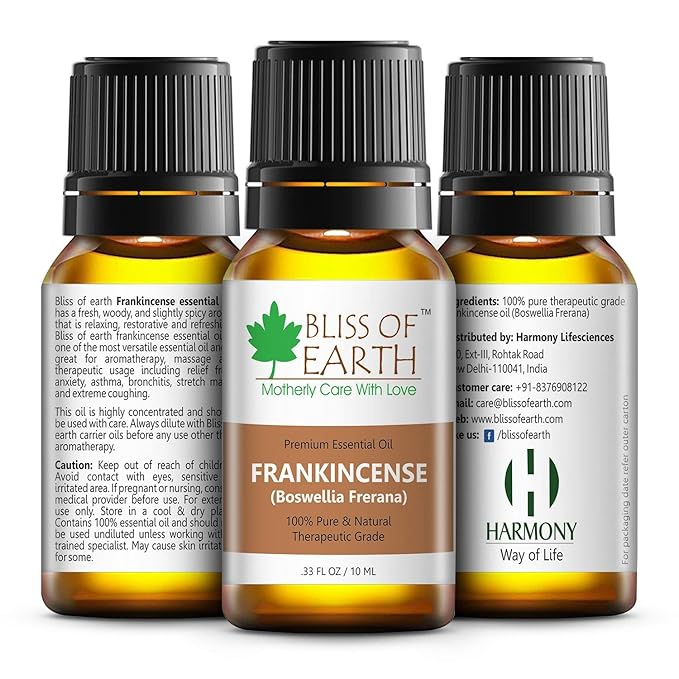 • VERSATILE SOLUTION: Frankincense oil is one of the most popular essential oils. It is known for its anti inflammation & pain relieving properties. Because of its impressive level of quality, bliss of earth frankincense oil lets you experience the full benefits of fresh, woody, balsamic, slightly spicy and fruity aroma.