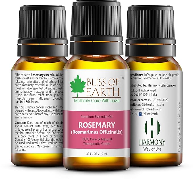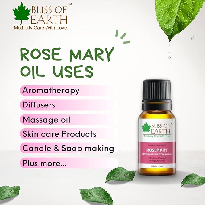 • Because of its impressive level of quality, bliss of earth rosemary oil lets you experience the full benefits of the fresh, herbaceous, sweet & slightly medicinal aroma. It is great for aromatherapy, massage and therapeutic USE.