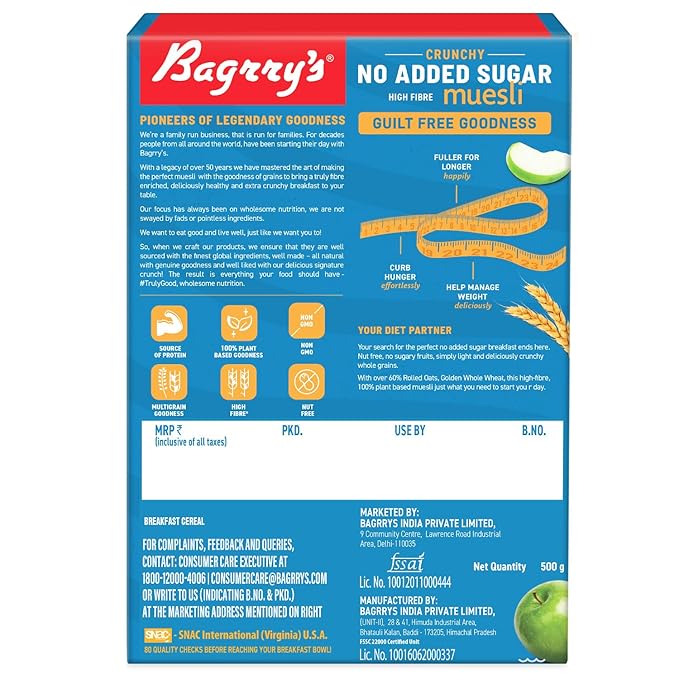 • Bagrry’s Crunchy Muesli - No Added Sugar is the perfect well-balanced breakfast for weight watchers, diabetics and for all those who aspire to stay fit