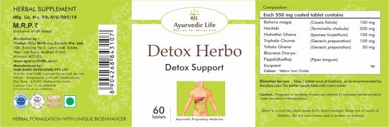 • Detox Herbo is a blend of high-quality herbs synergistically selected and blended together to form easy-to-swallow tablets.