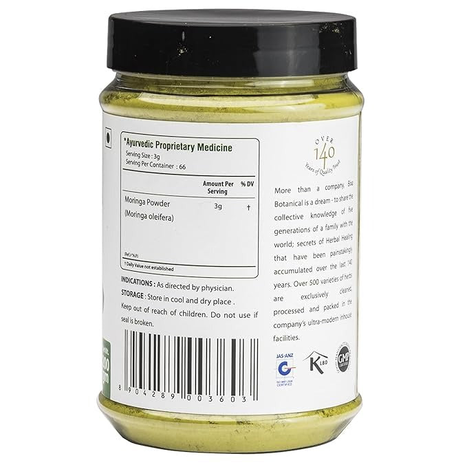- Moringa Leaf supports impressive range of medicinal uses with high nutritional value (rich in essential amino acids, vitamins, potassium, calcium, iron etc) and promotes overall health & vitality due to its anti-oxidants, alkalizing properties.