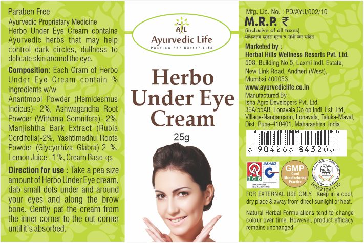 - Take a pea-size amount of Herbo Under Eye cream, dab small dots under and around your eyes and along the brow bone.
