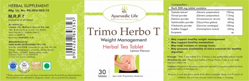 - Trimo Herbo tea tablets is an Ayurvedic combination of triphala, trimand, dalchini, yashtimadhu, suddha guggul, vrikshamla powder, etc. to support a healthy weight loss journey.