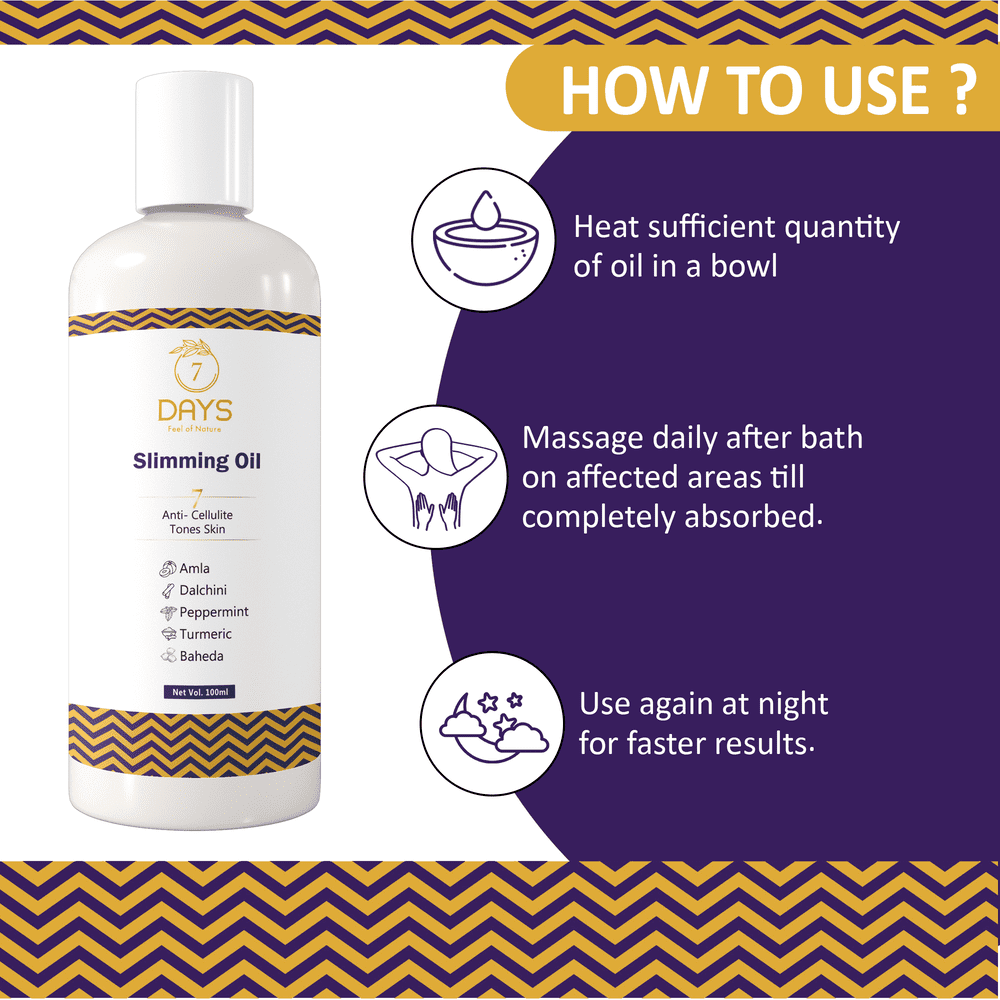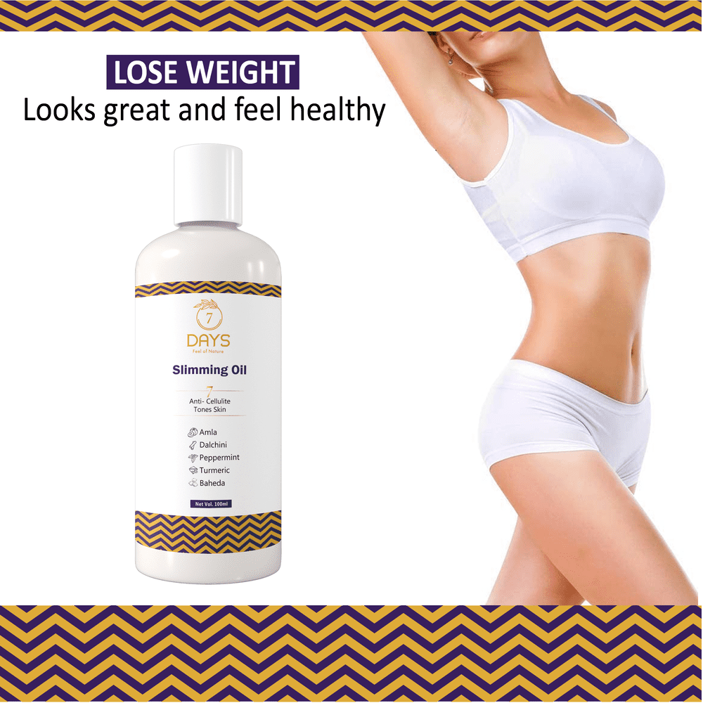 • 7 Days slimming oil is Anti Cellulite massage Oil natural ingredients that helps in reducing fat, tightening of Slack Tissues, Detoxifies the body & prevent the storage of triglycrides.