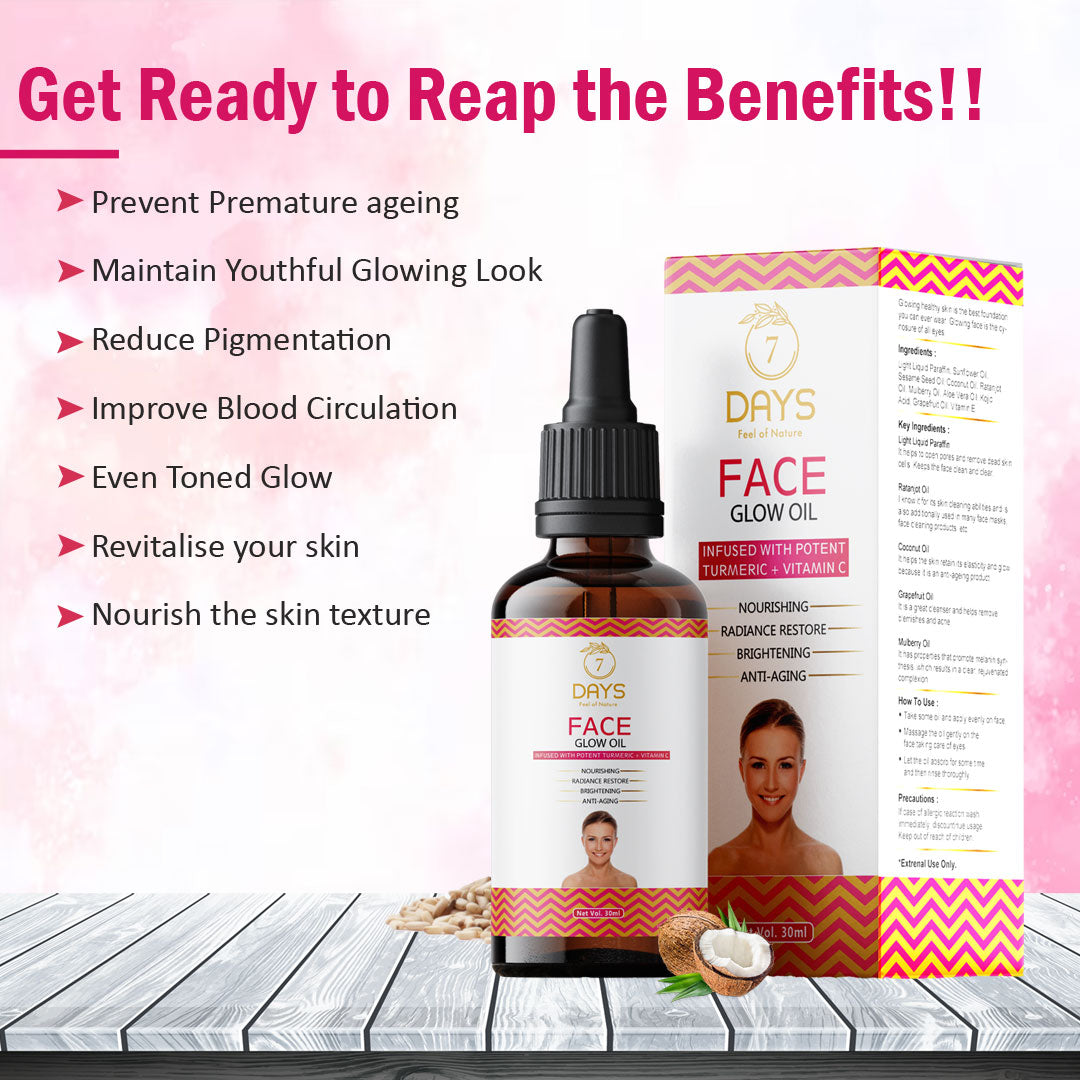 - Say goodbye to skin dryness & signs of aging such as lines, wrinkles & skin sagging with the 7 Days Face Glow Oil made with the best blend of natural ingredients that work together to give you picture perfect skin with regular use!