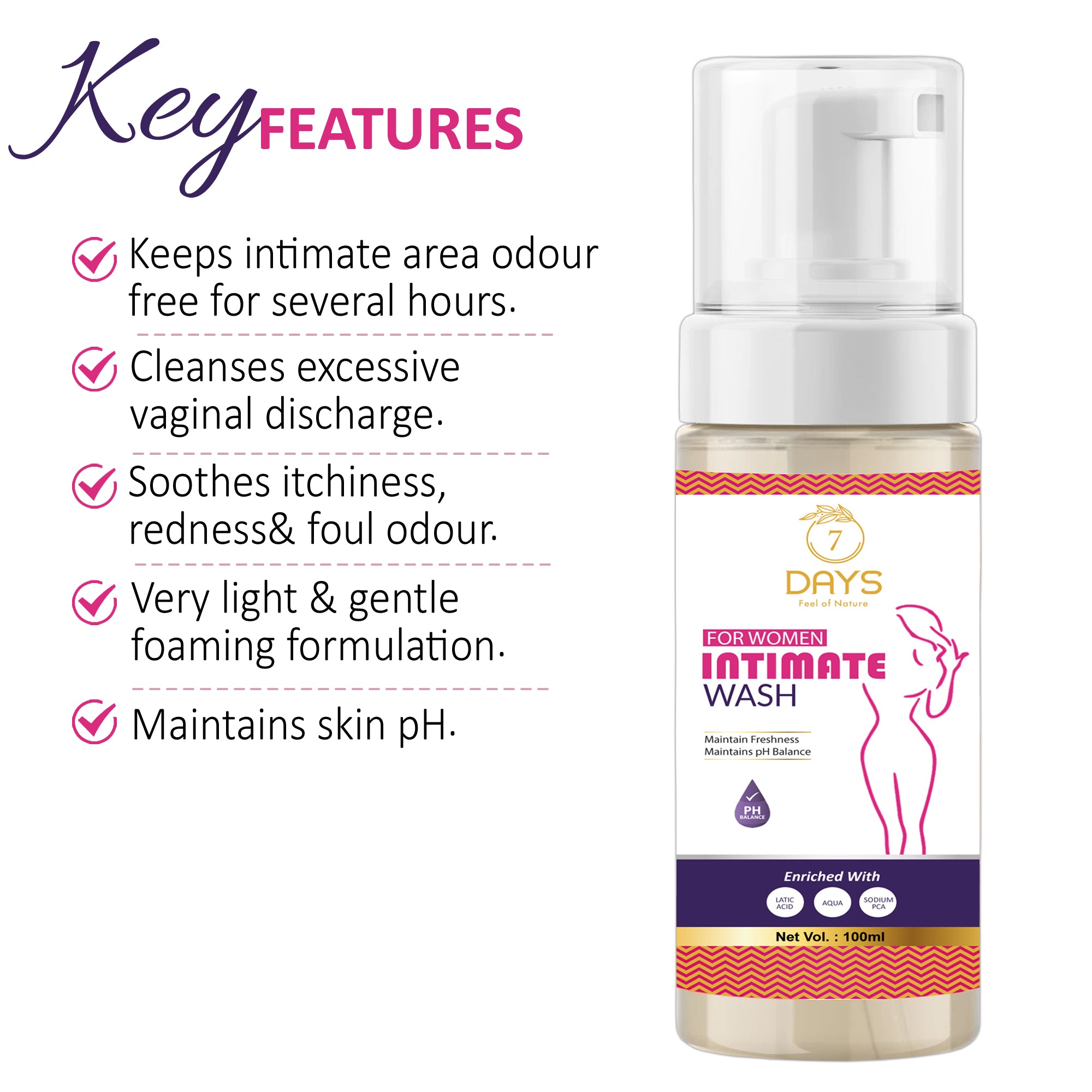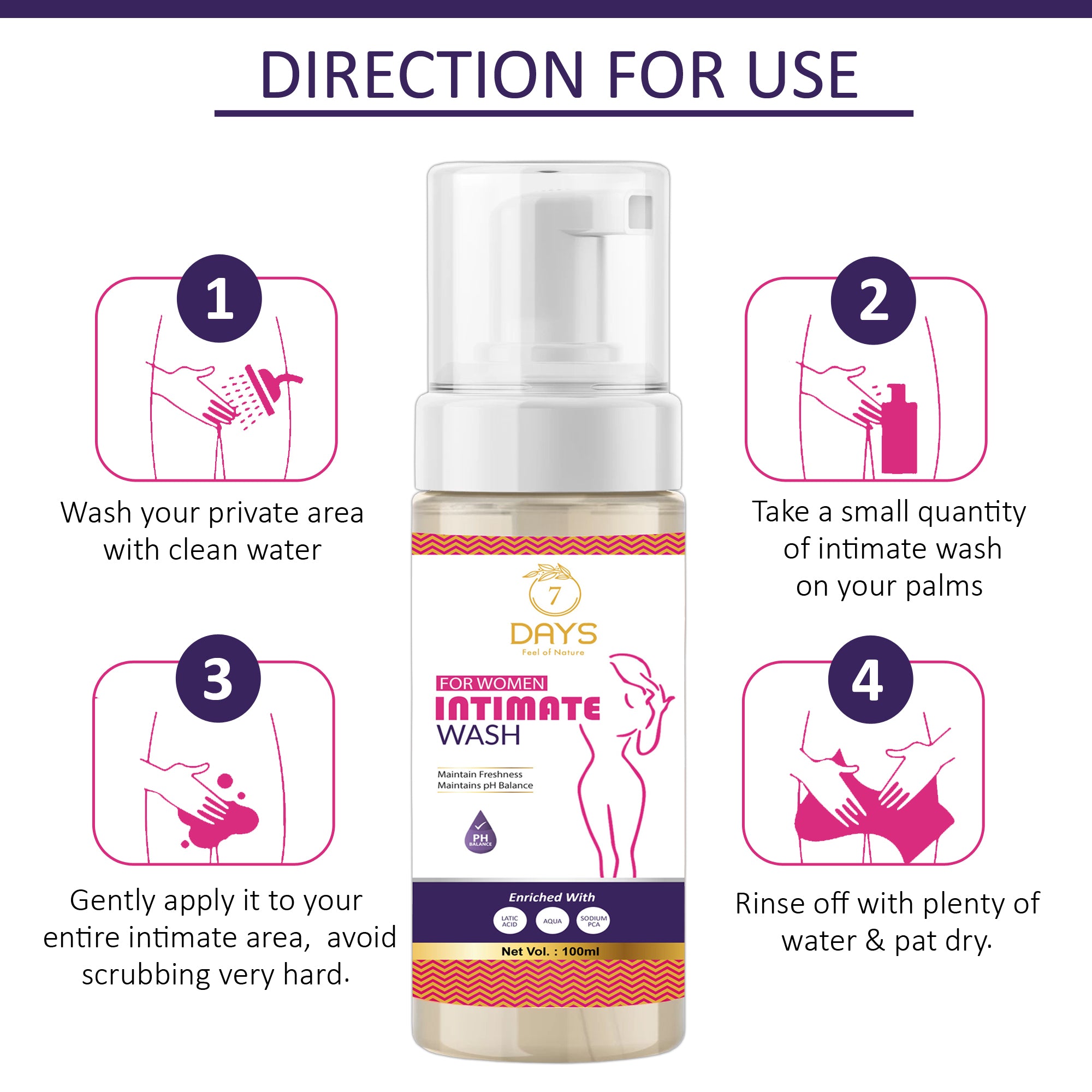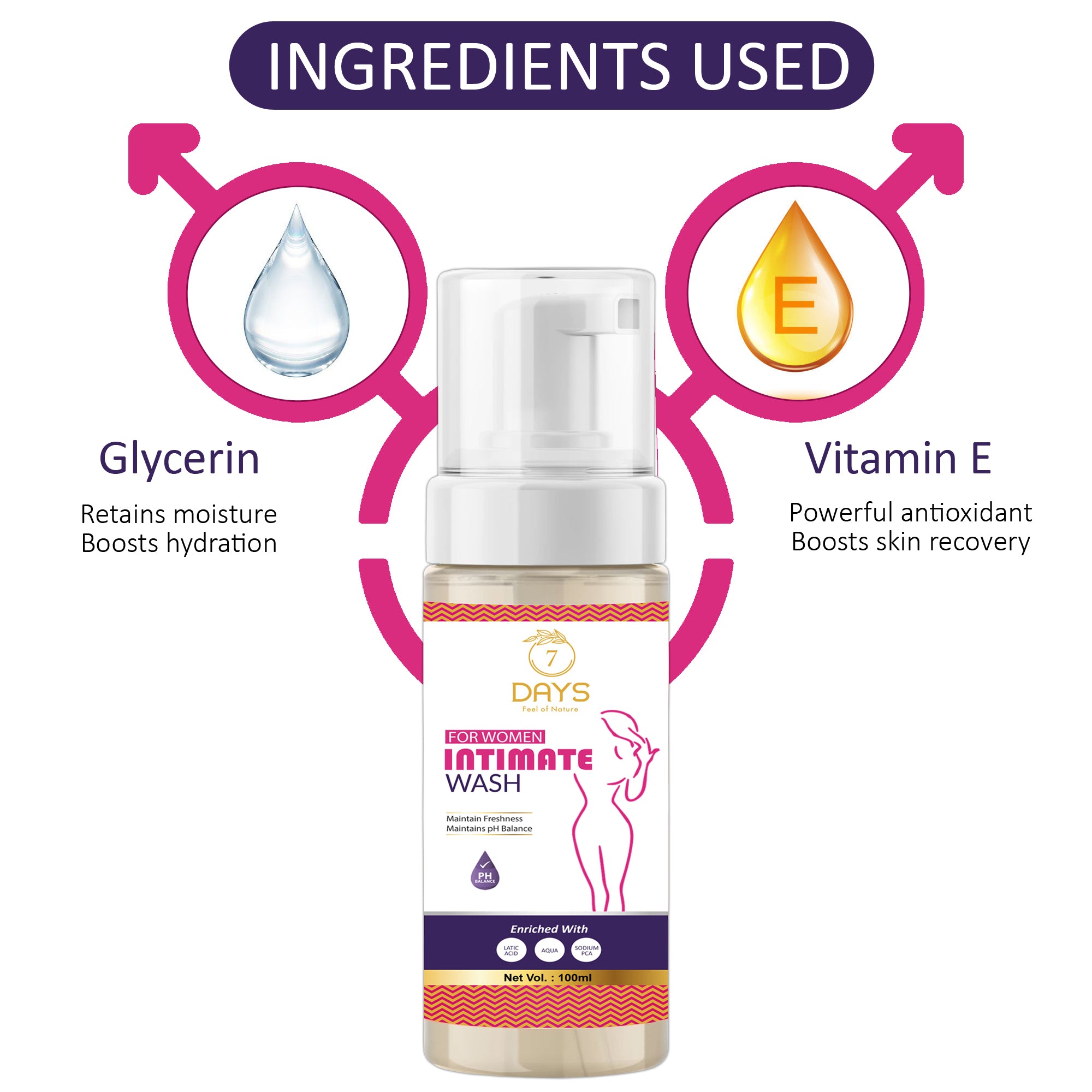 - This 7 Days Intimate Wash is the best intimate wash for women formulated with ingredients such as glycerin & vitamin to provide gentle cleansing & hydration to your intimate areas without disturbing skin pH.