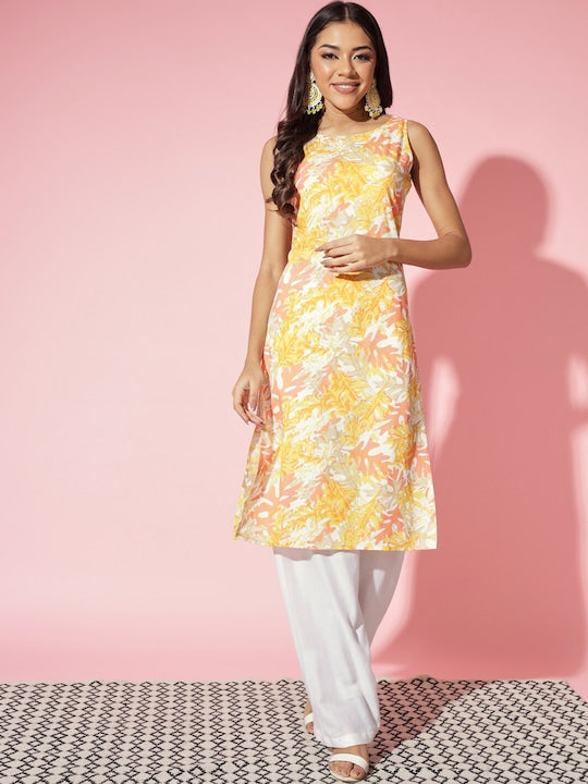 Myshka Floral Printed Sleeveless Straight Kurta