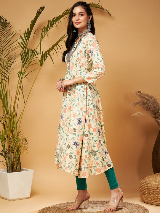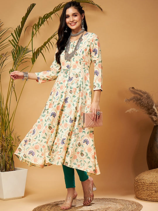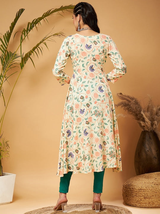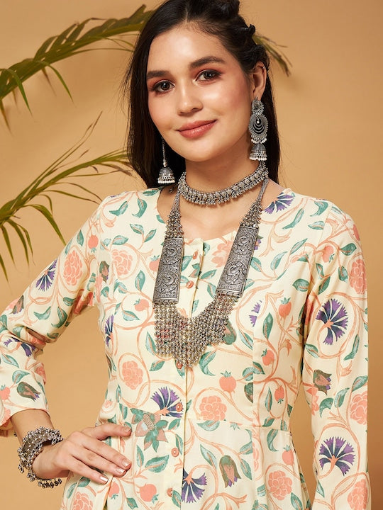 Shae by Sassafras Beige Floral Printed Front Open Anarkali Kurta