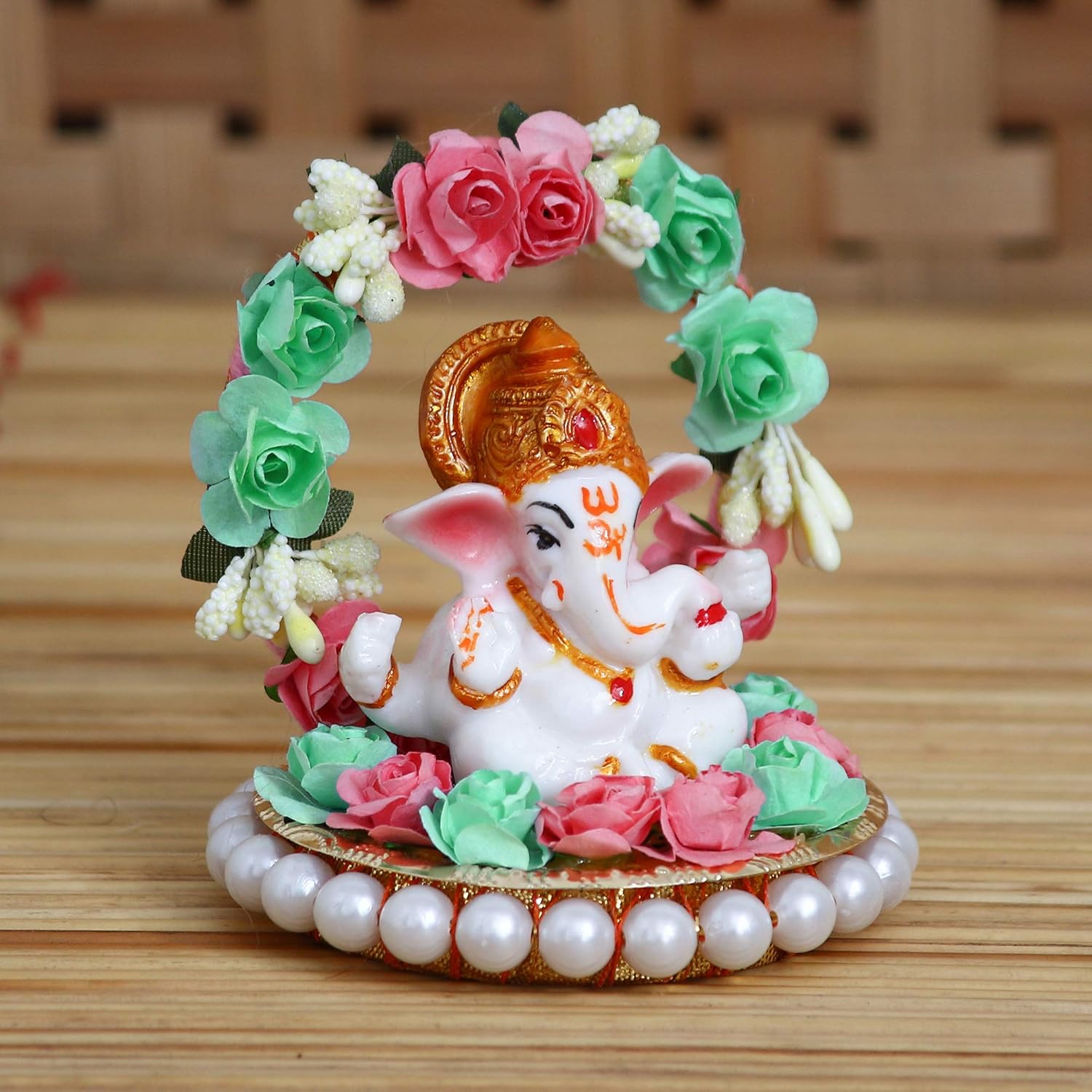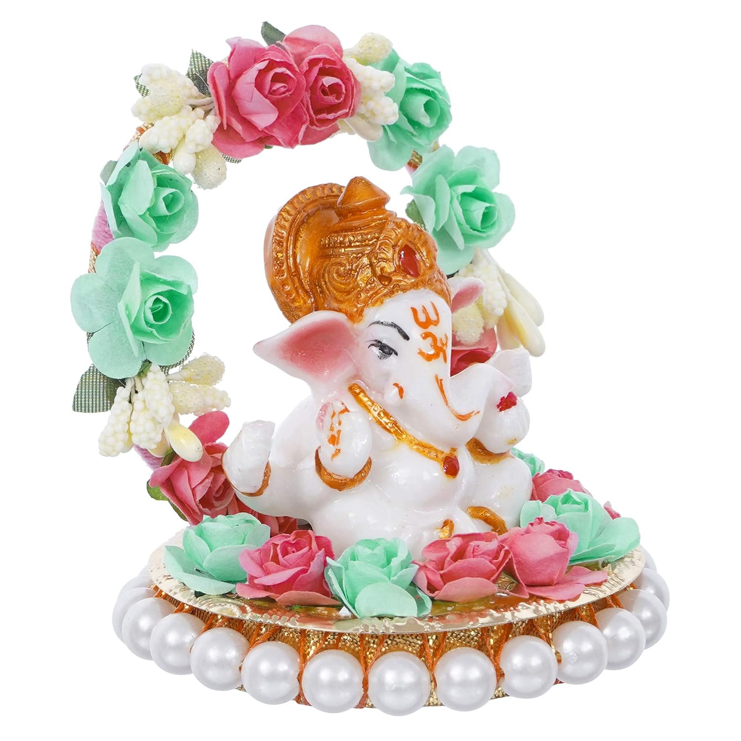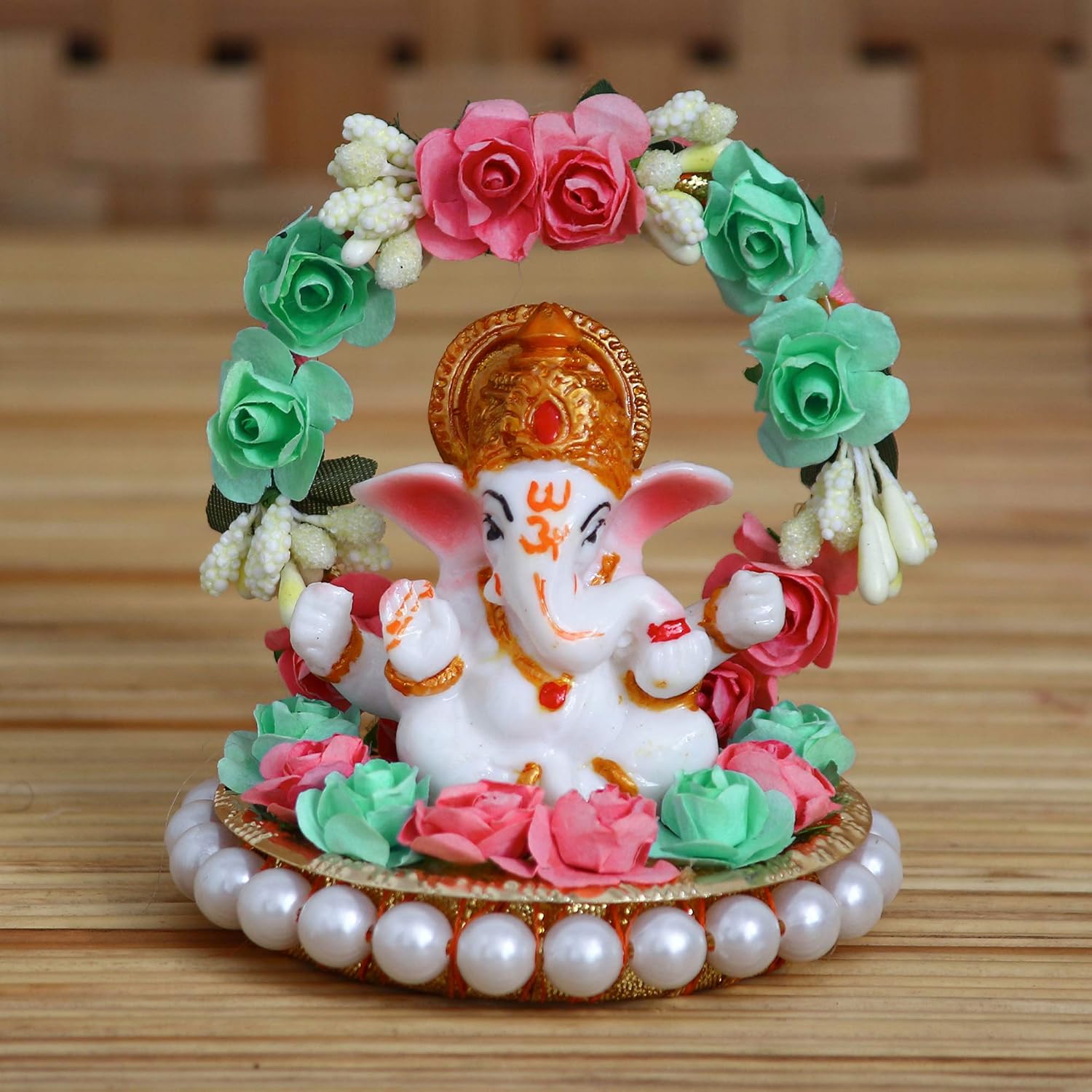 • Package Content - One Lord Ganesha Idol on Decorative Handcrafted Plate with Throne of Pink and Green Flowers