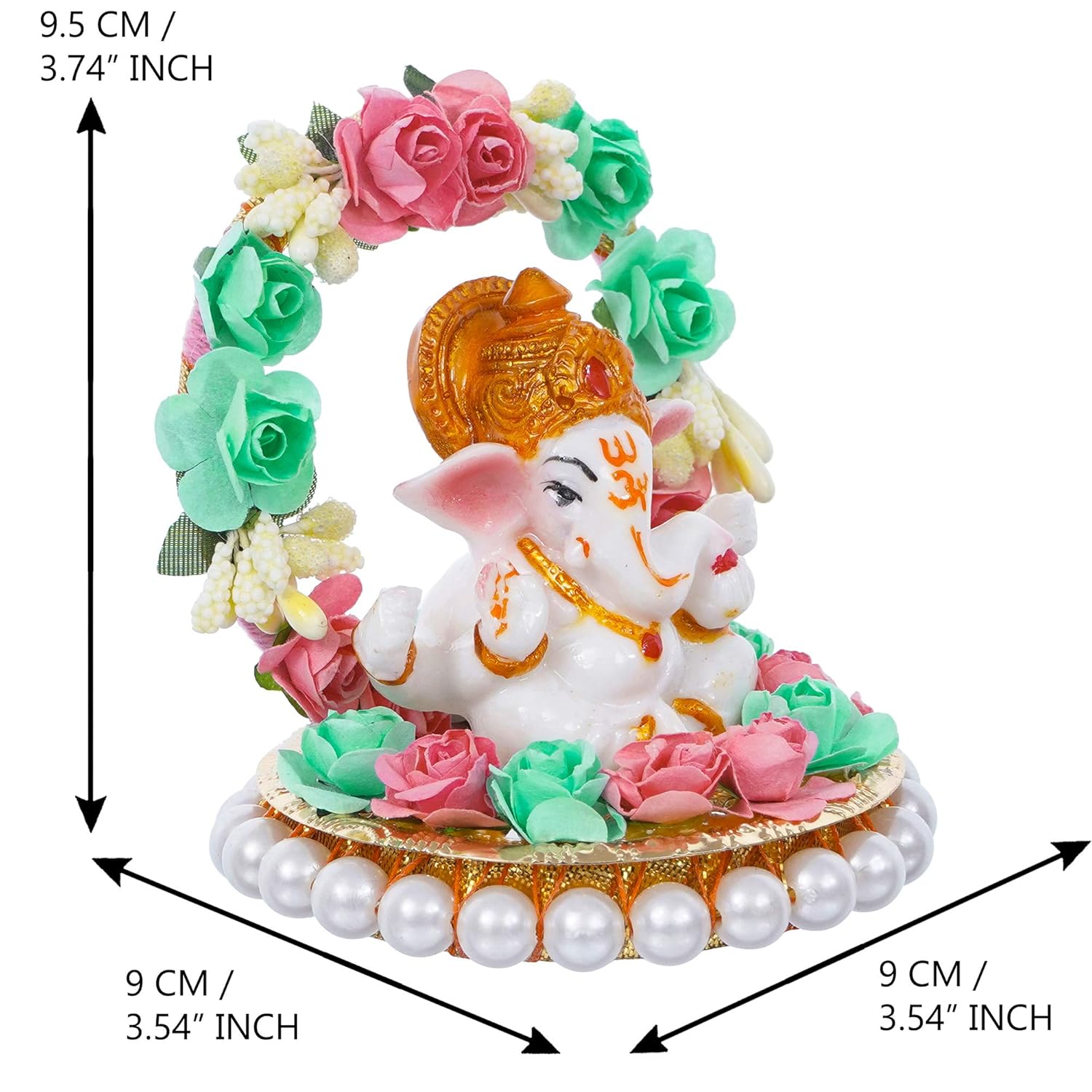 Ecraftindia Lord Ganesha Idol on Decorative Handcrafted Plate With Throne of Pink and Green Flowers
