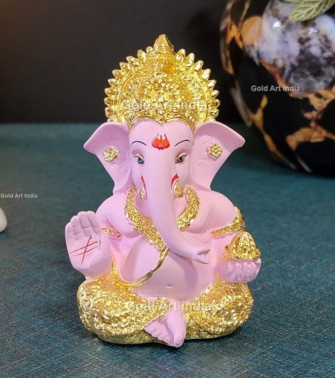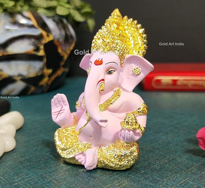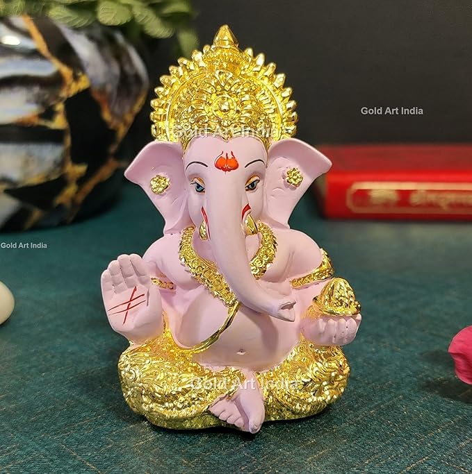 Gold Art India Gold Plated Ganesha with Terracotta Colour Perfect for Car Dashboards (MukutGoldPink)