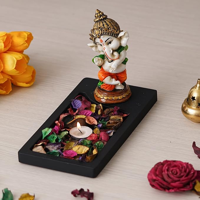 - Package Contents : Orange, Brown, White & Black Polyresin Baal Ganesh Dancing Showpiece with Rectangle Wooden Base Plate, Fragranced Petals & Tealight