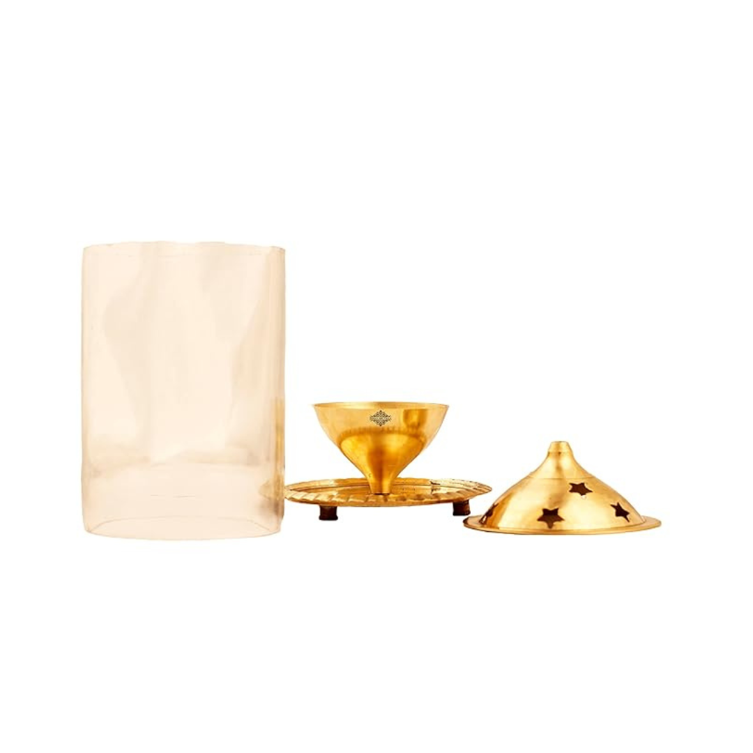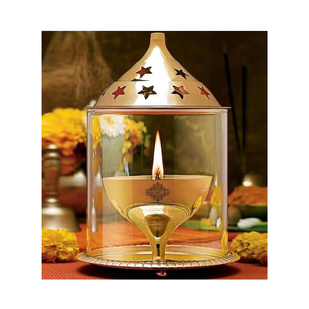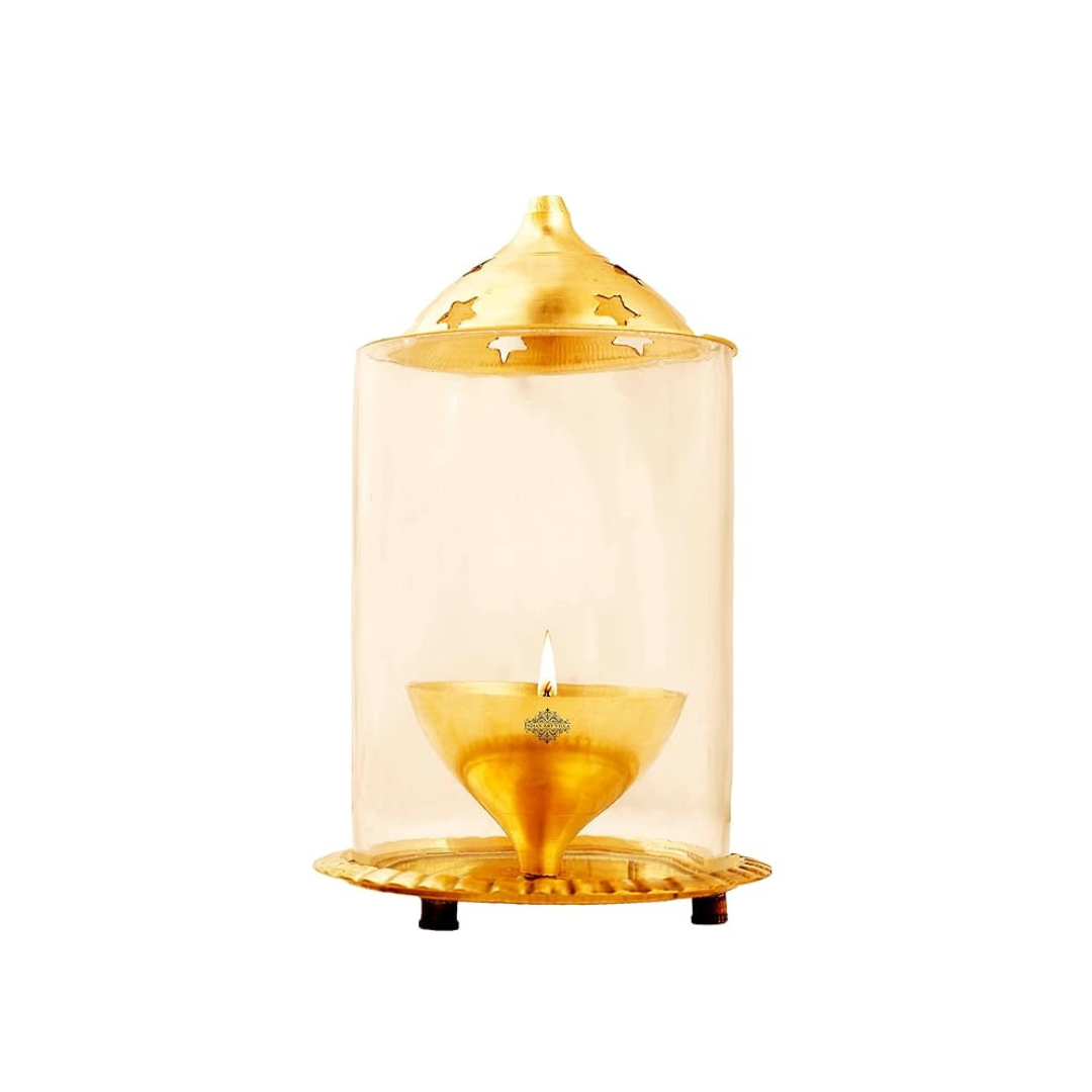Indian Art Villa Brass Akhand Jyot Diya with Molded Glass and Plate for Diwali Gifts Item - 720 gms