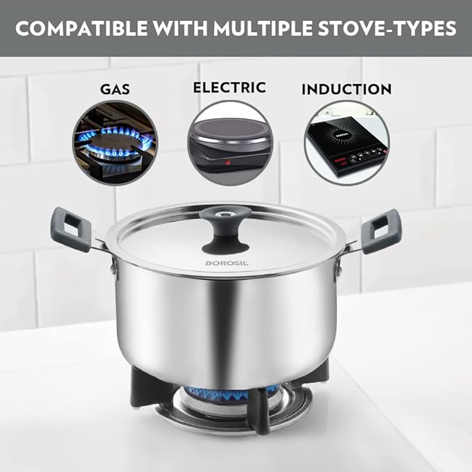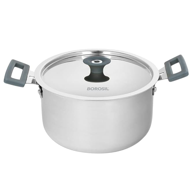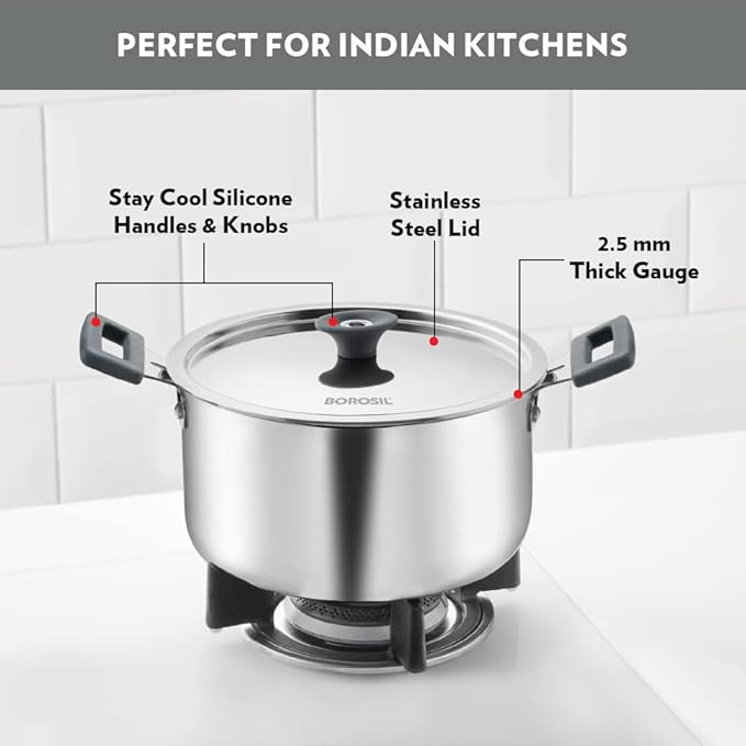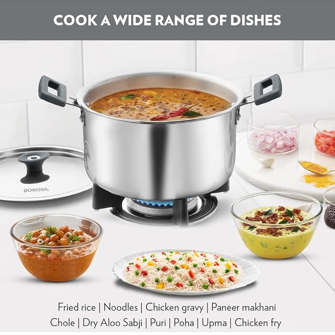 • FOOD GRADE SS-304 STAINLESS STEEL - Whether you're an amateur cook or a pro, you'll appreciate the versatility this stainless steel kadai brings to your kitchen. The Borosil stainless steel induction kadai with lid can be used to fry puris, samosas or simmer dals, subzis and curries. The lid catches any oil spits so it's great for large batch, long hours cooking activities. The heavy gauge stainless steel also makes the vessel durable and long-lasting.