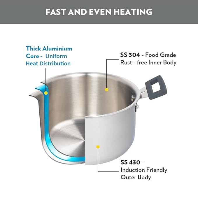 • SAFE FOR COOKING, STICK RESISTANT- The triply stainless steel cookware doesn't discolor or affect any ingredient as the stainless steel cooking surface does not react with any food types. Food does not get burnt while sauteing/frying or stick to the bottom, therefore it is stick-resistant.