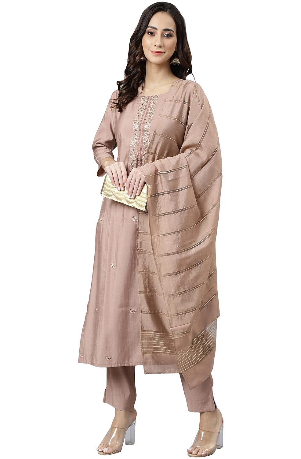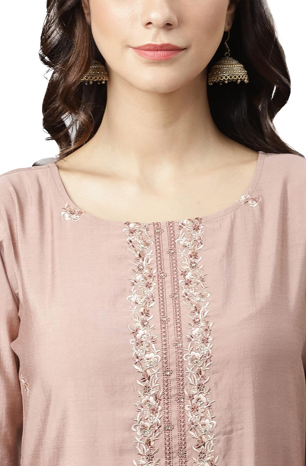 Janasya Women's Dusty Rose Viscose Blend Embroidered Kurta with Pant