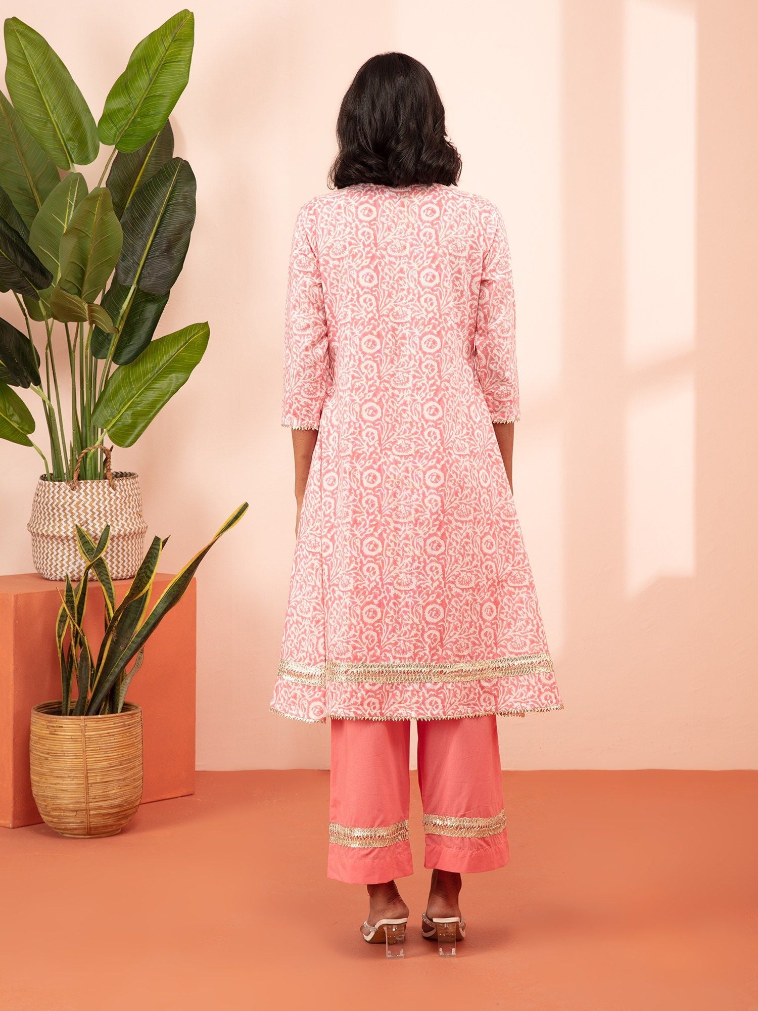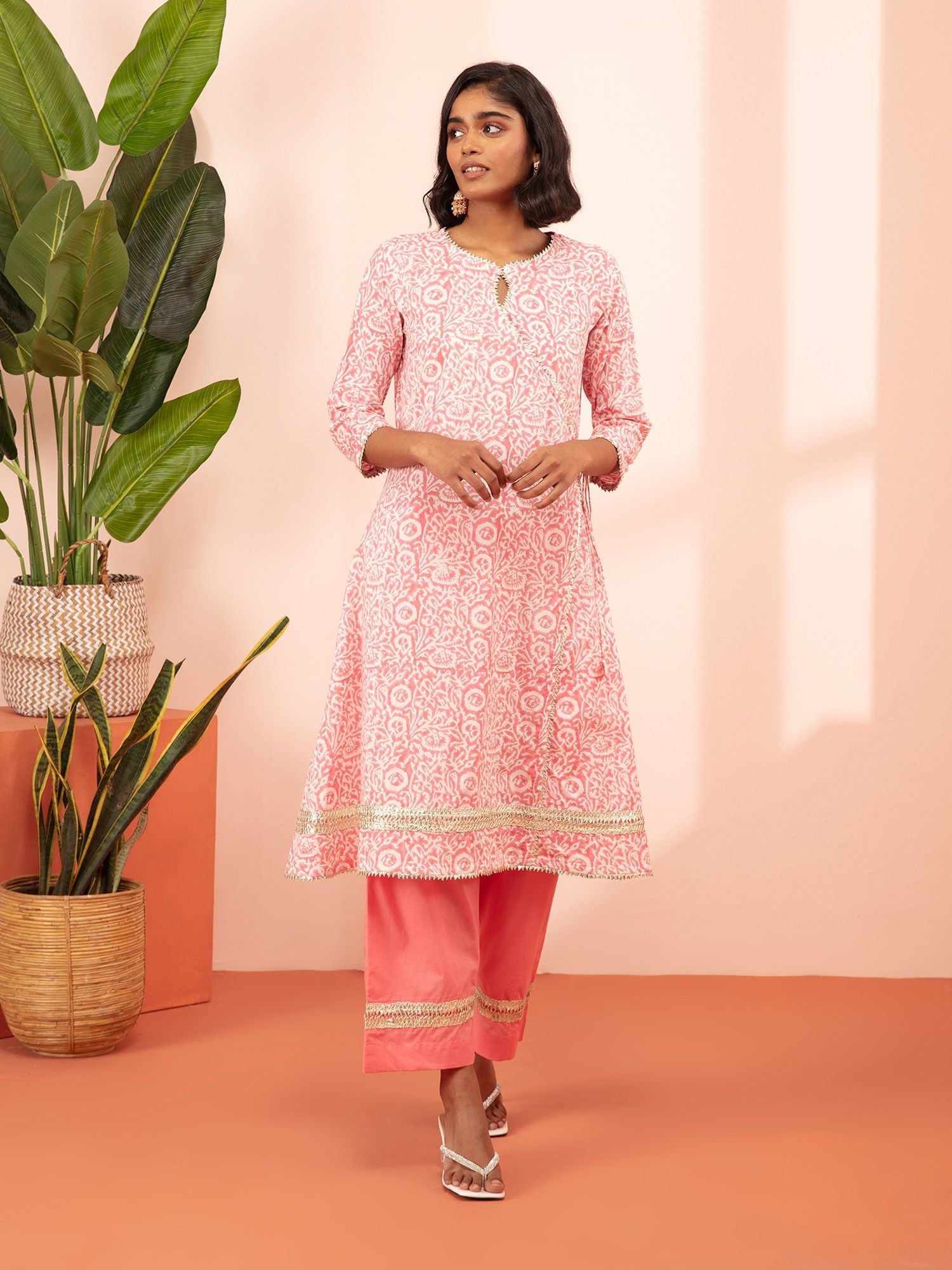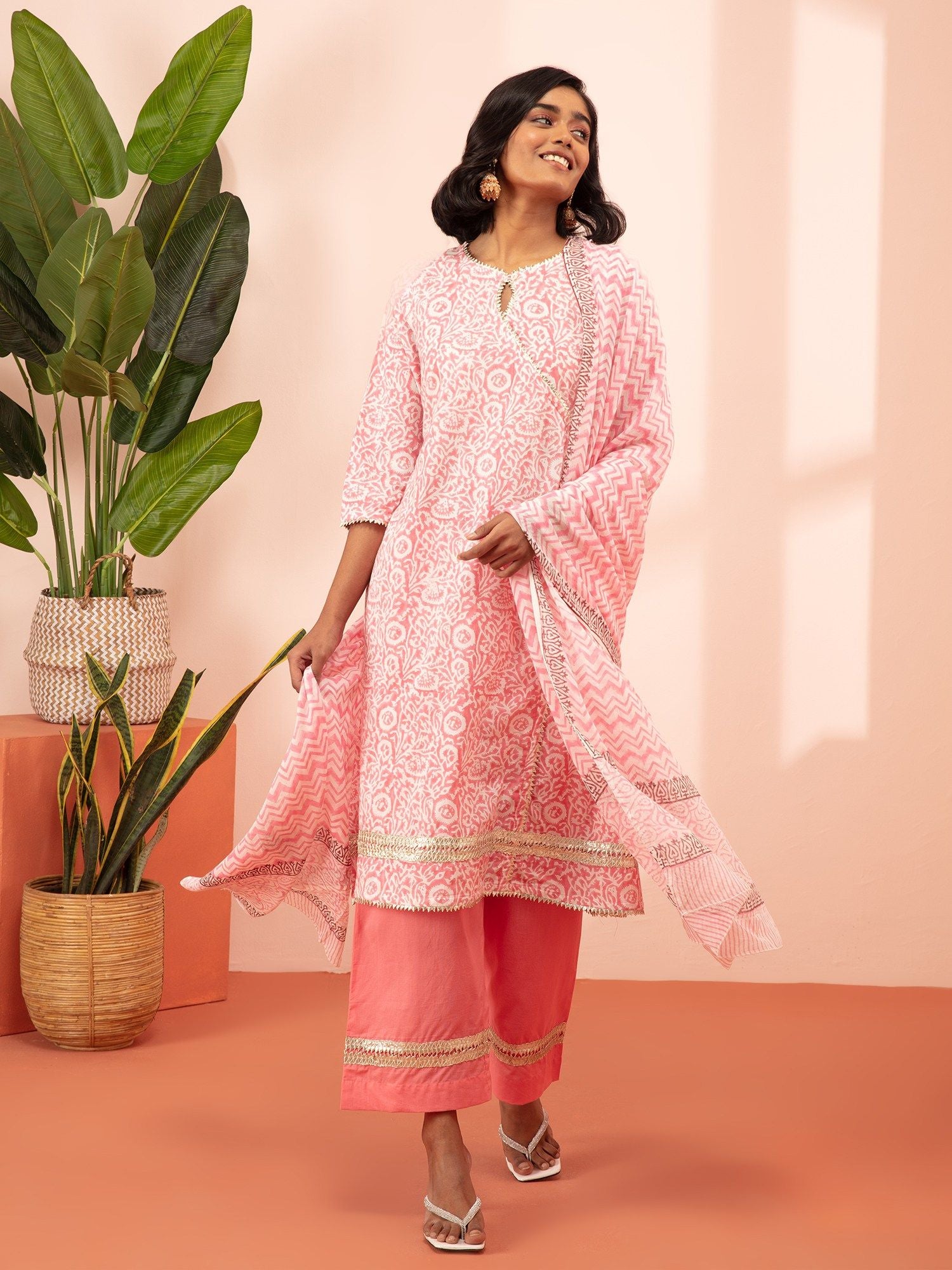 Likha Gulbarg Pink Hand Block Printed Kurta with Dupatta LIKSKD150 (Set of 3) - M
