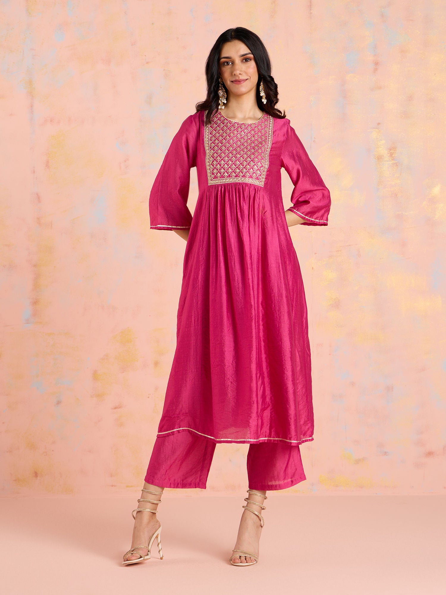 • This set includes an a-line fit kurta with intricate zari embroidery on the yoke, accented with gota lace.