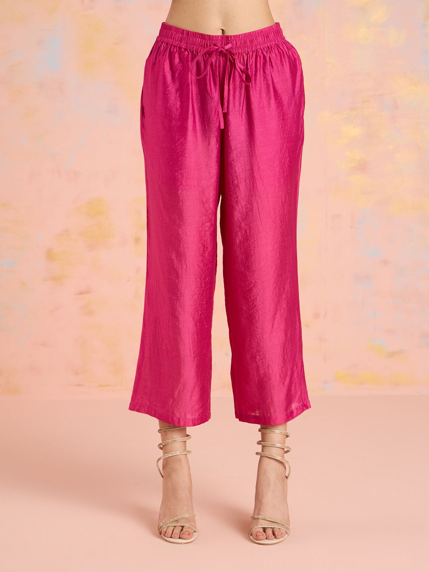 • From the "Garden Groove, A Floral Story Collection by Likha," comes a Rose Pink Chanderi Kurta Pant Dupatta set that encapsulates the beauty of nature.