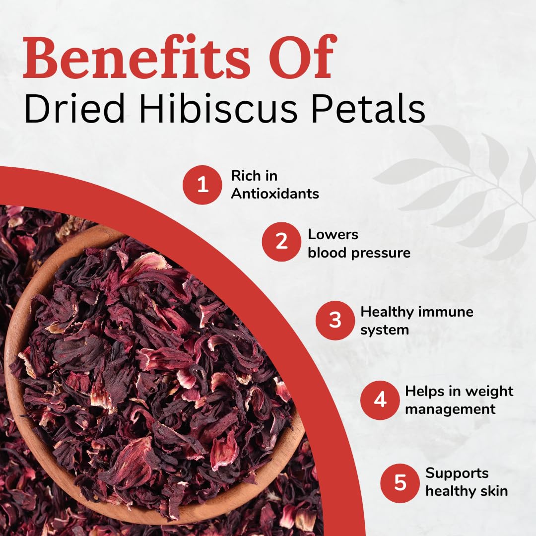 • Premium Quality Hibiscus Petals: Our naturally dried hibiscus petals are sourced from the finest hibiscus flowers, ensuring a premium and vibrant product.