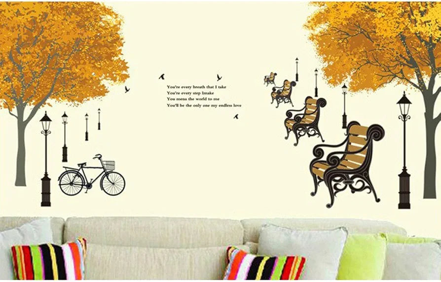 Decals Design Trees in Autumn Antique Lamps Benches Bicycle and Love Quote Wall Sticker