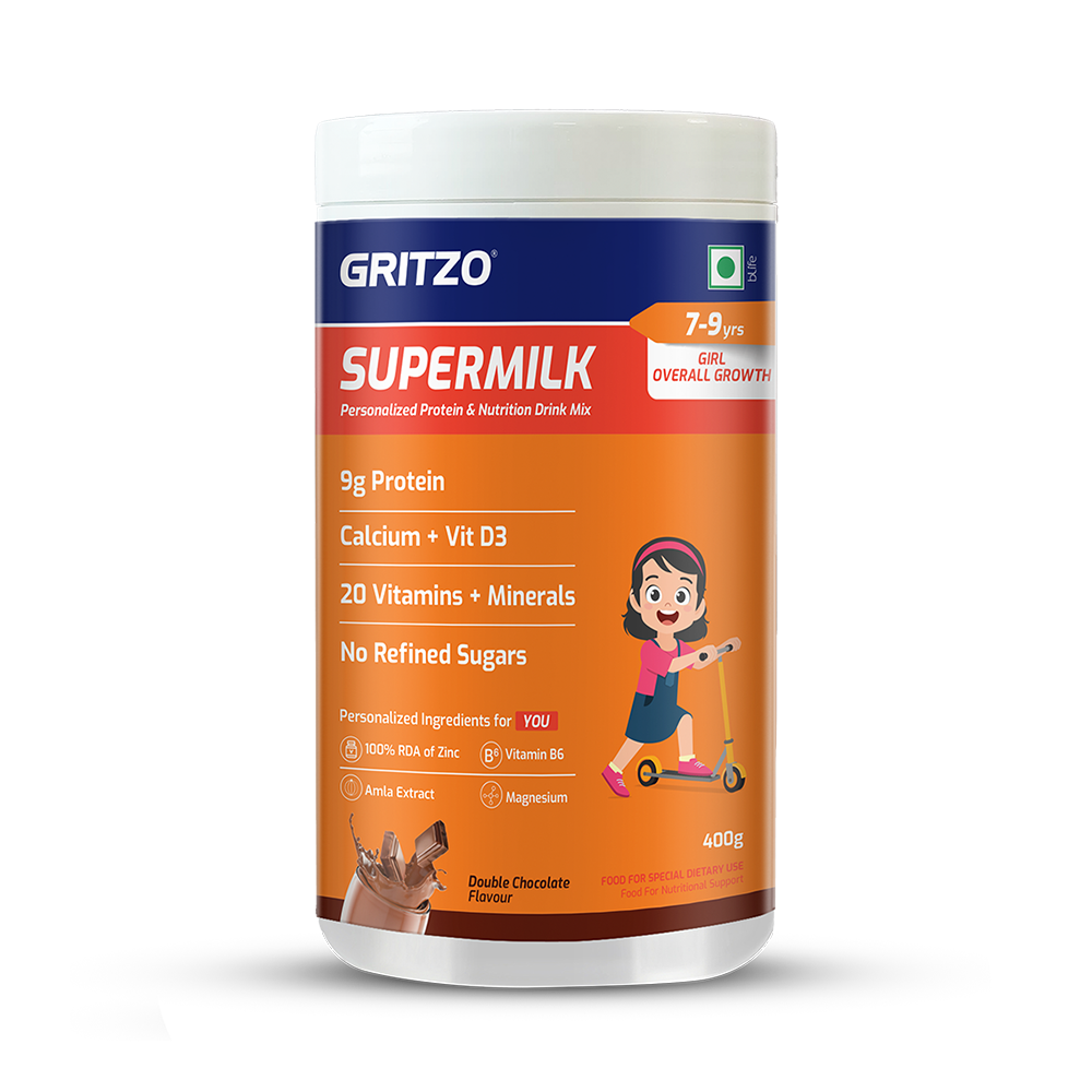 • DAILY NUTRITION FOR GIRLS: Gritzo SuperMilk provides 9g of protein per 33.3g serving. It contains protein that has been scientifically proven to get 100% absorbed in the body. Children get 39% of daily protein and up to 100% of vitamins & minerals to enhance their growth & development.
