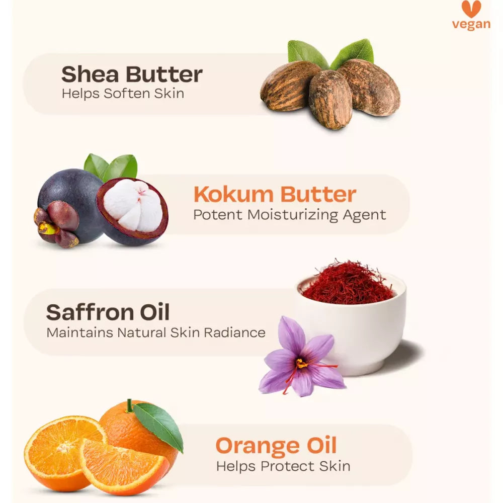 - Kokum butter and saffron oil ensure deep moisturization, and lasting hydration and reduce skin dryness.