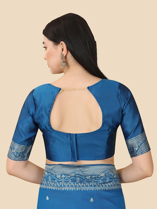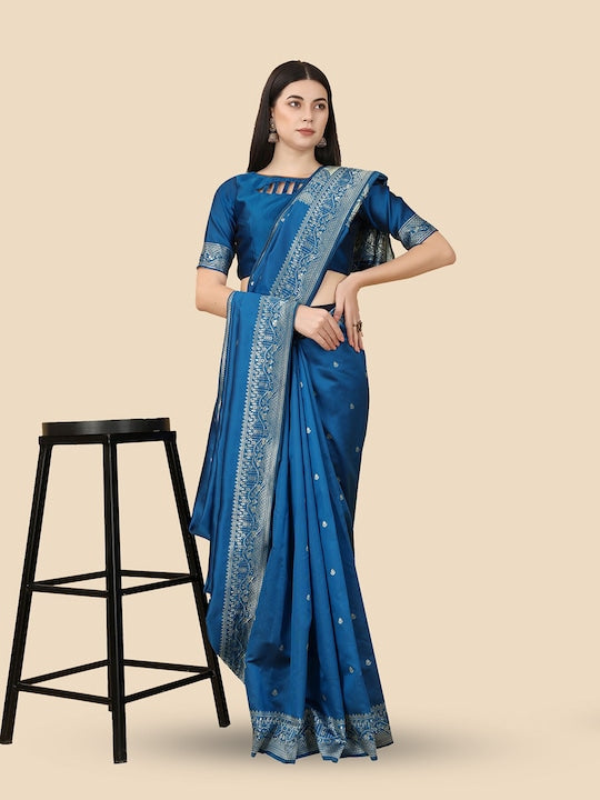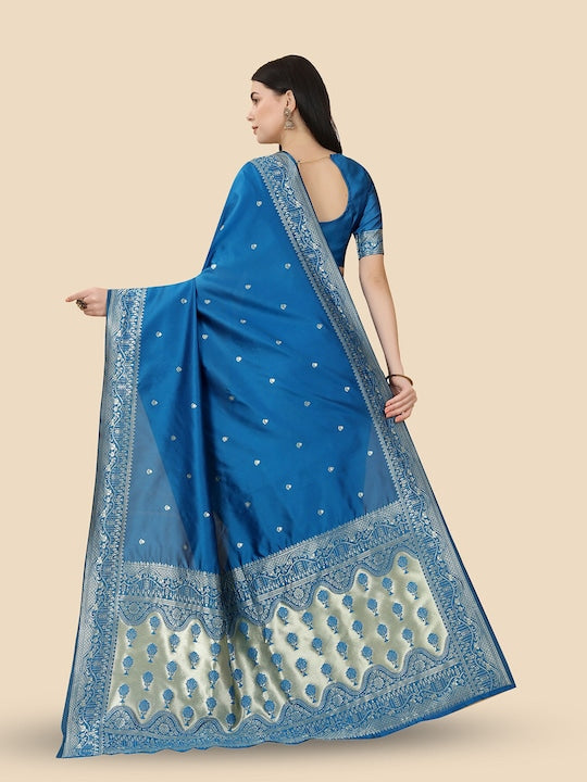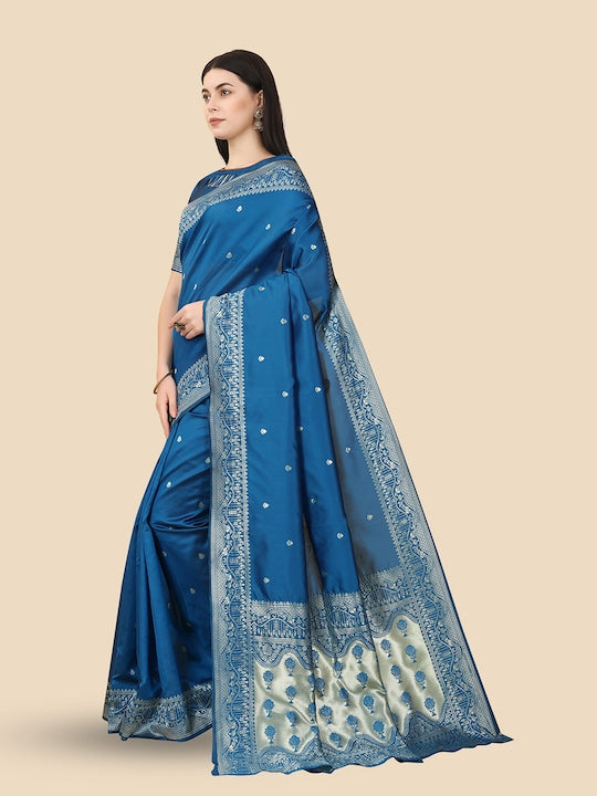 • Blue and gold-toned Banarasi saree