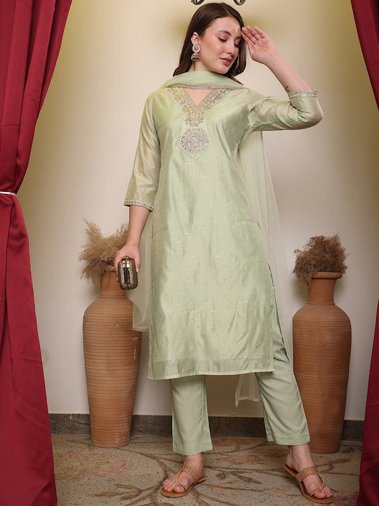 House of Pataudi Ethnic Motifs Embroidered V-Neck Straight Kurta With Trouser & Dupatta